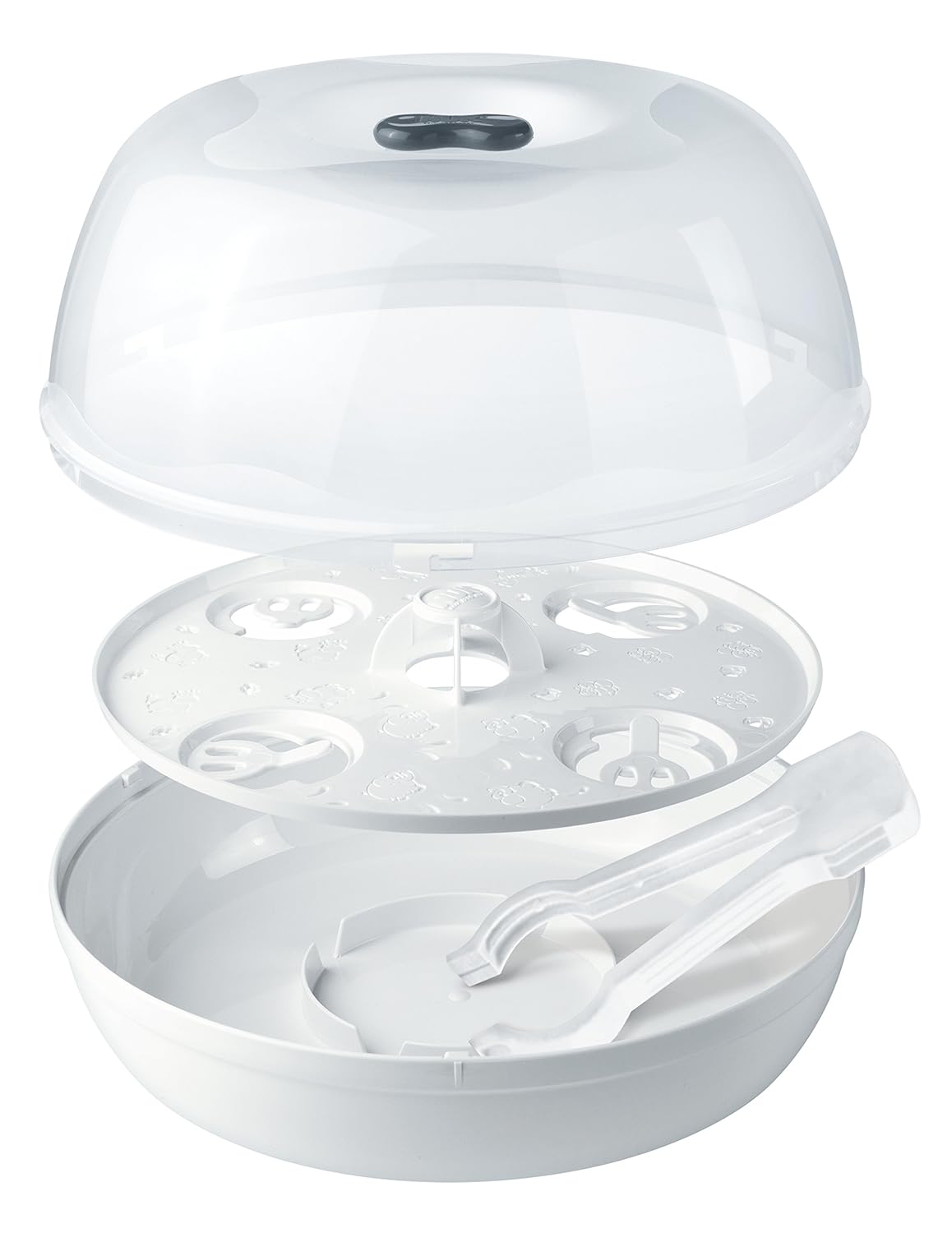 Gründliche Desinfektion von BabyzubehÃr. Reinigt und desinfiziert bis zu 4 Flaschen und ZubehÃr hochwirksam in nur 4 Minuten bei 1000 Watt. Geeignet für die meisten handelsüblichen Flaschen und Mikrowellen-Geräte von 500 bis 1000 Watt. Spezielle Form mit raumsparendem Flaschenhalter ermÃglicht ein extra großes FassungsvermÃgen von bis zu vier 300ml Flaschen inklusive ZubehÃr (Flaschen nicht enthalten). Inklusive Flaschenzange zum hygienischen Entnehmen der desinfizierten Teile. Desinfektionsvorgang von anerkanntem Labor geprüft. Auch geeignet für Mikrowellen-Geräte mit minimaler InnenhÃhe von 187mm. Innenbreite und -tiefe von 280mm.