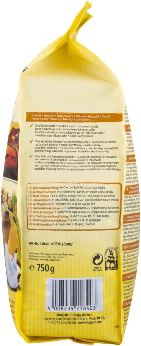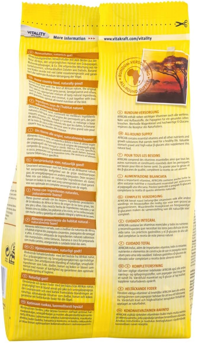 A highly nutritional mixture of fruits and seeds to provide a delicious and healthy meal for your parrot. Comprised of ingredients that would be found in the natural habitat, this large breed African parrot food is perfect for breeds such as the African Grey or the Senegal. Ingredients: Cereals, Seeds, Fruits (dates, carob and figs), Vegetables and Minerals.