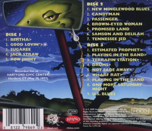 As they were prepping for the summer release of their first studio album in two years, Terrapin Station (a Top 40 Billboard album), the Grateful Dead blew the roof off Connecticut’s Hartford Civic Center on the closing night of their spring ’77 tour. A show long sought after by Dead fans, the set features inspired versions of songs that would soon come out on Terrapin, including ‘Estimated Prophet,’ ‘Passenger,’ and the title track. Epic jams also include, of course, ‘One More Saturday Night,’ ‘Jack Straw,’ ‘Candyman,’ ‘U.S. Blues,’ and takes on ‘Tennessee Jed’ and ‘Sugaree’ that many fans claim are as good as any ever recorded. Released in celebration of the Dead’s ’09 tour which plays Hartford and presented in HDCD, the recordings from this previously unissued show were mastered from the original two track master analog tapes.