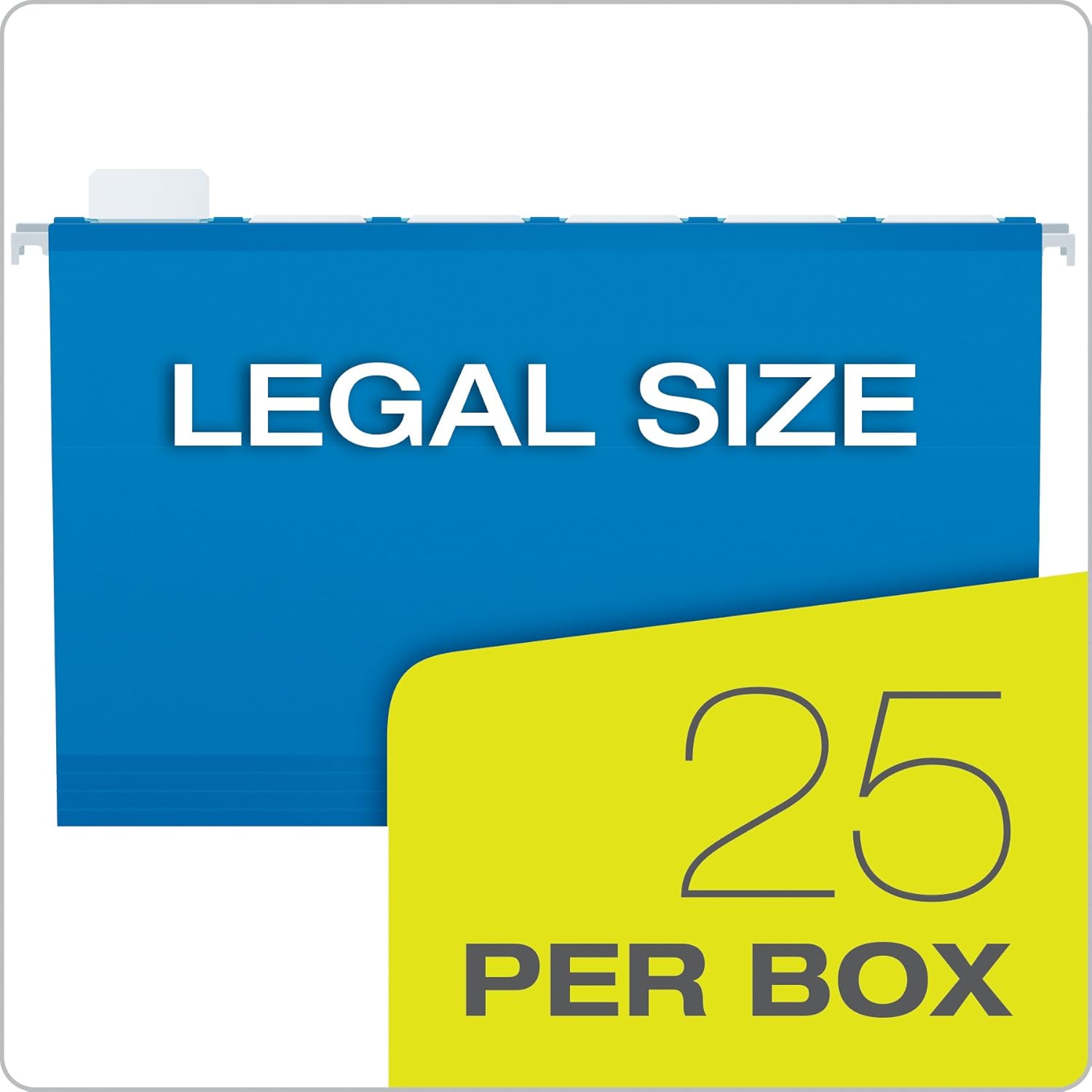 Pendaflex Ready-Tab Reinforced Hanging Folders feature 6 built-in tabs. Simply lift, label and file. Folders are lighter in color on the inside to prevent misfiling. Reinforced top and bottom edges make these time savers extra durable. Includes a printer-ready sheet of adhesive labels. Legal size, assorted colors: blue, red, green, orange, yellow. 25 Per box.