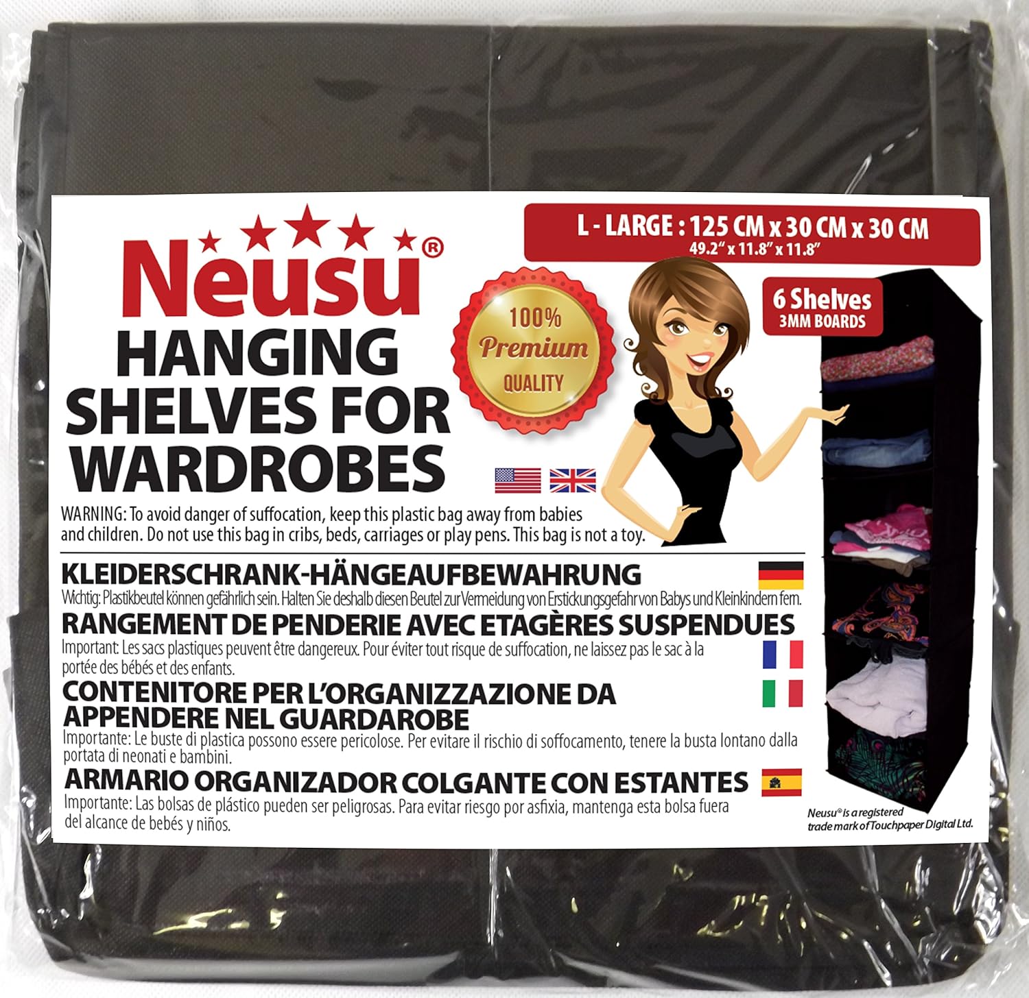 Add shelves to your wardrobe instantly with this hanging organiser. Capable of holding clothes, shoes, accessories, or heavier items like books, these shelves are made to Neusu’s standards. That means it’s made from 100gsm fabric, 33% stronger than similar, standard quality hanging organisers, while the shelves are reinforced with 3mm board, itself 50% stronger than the board used in similar hanging shelves.