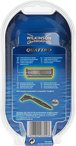 Looking for a smooth and effortless shave? Then look no further. Wilkinson Sword Quattro is now more comfortable than ever.This high performance system razor with 2 durable blades features a lubricating strip with Aloe Vera and an ergonomic rubberised handle for total control.