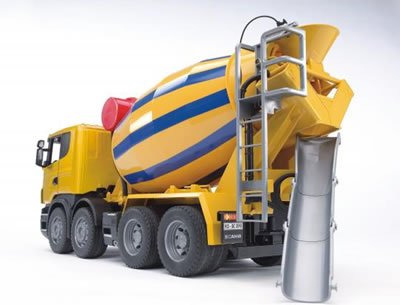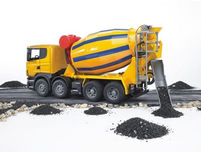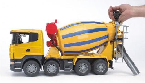 New Scania has realistic cement mixing truck for hours of fun! Operate the crank to make the cement mixer actually spin. Door’s open for easy access to the Operator’s Cab or tilt cab forward to view the engine in full detail. Features tread tires and a movable chute that is actually fed by the drum. Rocks or sand, mix what you dare, with this fun new Cement mixer imagination is your only limitation. Scania Truck’s are the newest Brand to the Bruder collection and are made with the highest quality plastic and the superior detail that is expected of a Bruder Truck.