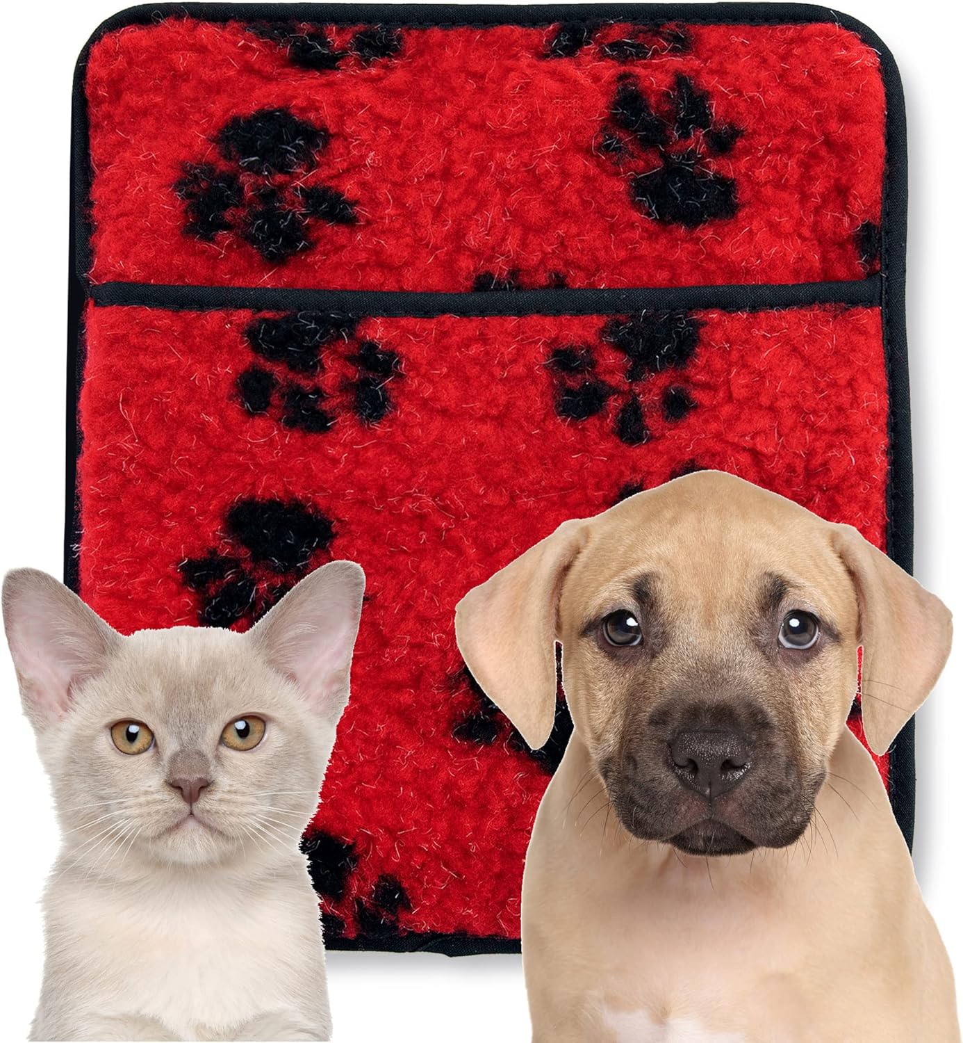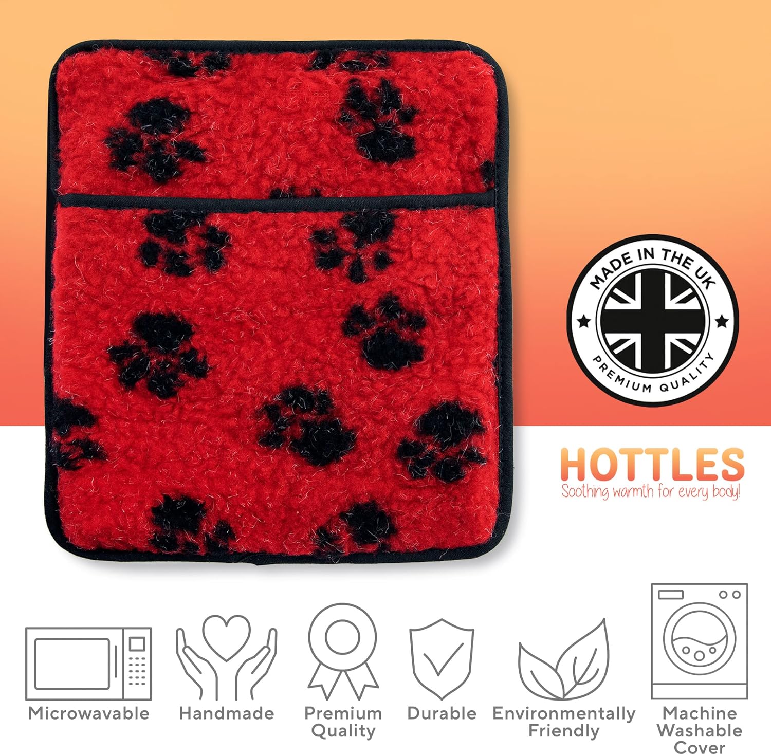 New Red Paw Print Pet Lambswool Hottie – pet heater. Micro-hottie microwave hot water bottle in a cosy red lambswool fleece cover with black paw prints. The Hottie microwave pet heater in a robust bite and claw resistant washable polyurethane cover. The microwave pet warmer can be used on its own or can be placed in a pet bed or carrier. The gentle sustained warmth is ideal to relax and keep your pet warm. Suitable for kittens or puppies as well as elderly cats and dogs. Ideal to aid recovery and reduce stress after that visit to the vet. Hottie microwave hot water bottles do not contain any harmful gels, waxes or chemicals. Even if your dog or other animal does chew it up, it will come to no harm. Your Hottie pet warmer can be heated in the microwave in a couple of minutes and will give hours of warmth and comfort. NOTE: The Hottie pet warmer does not get very hot like conventional hot water bottles it gets warm and lasts a few hours and then gradually cools down. Please follow h