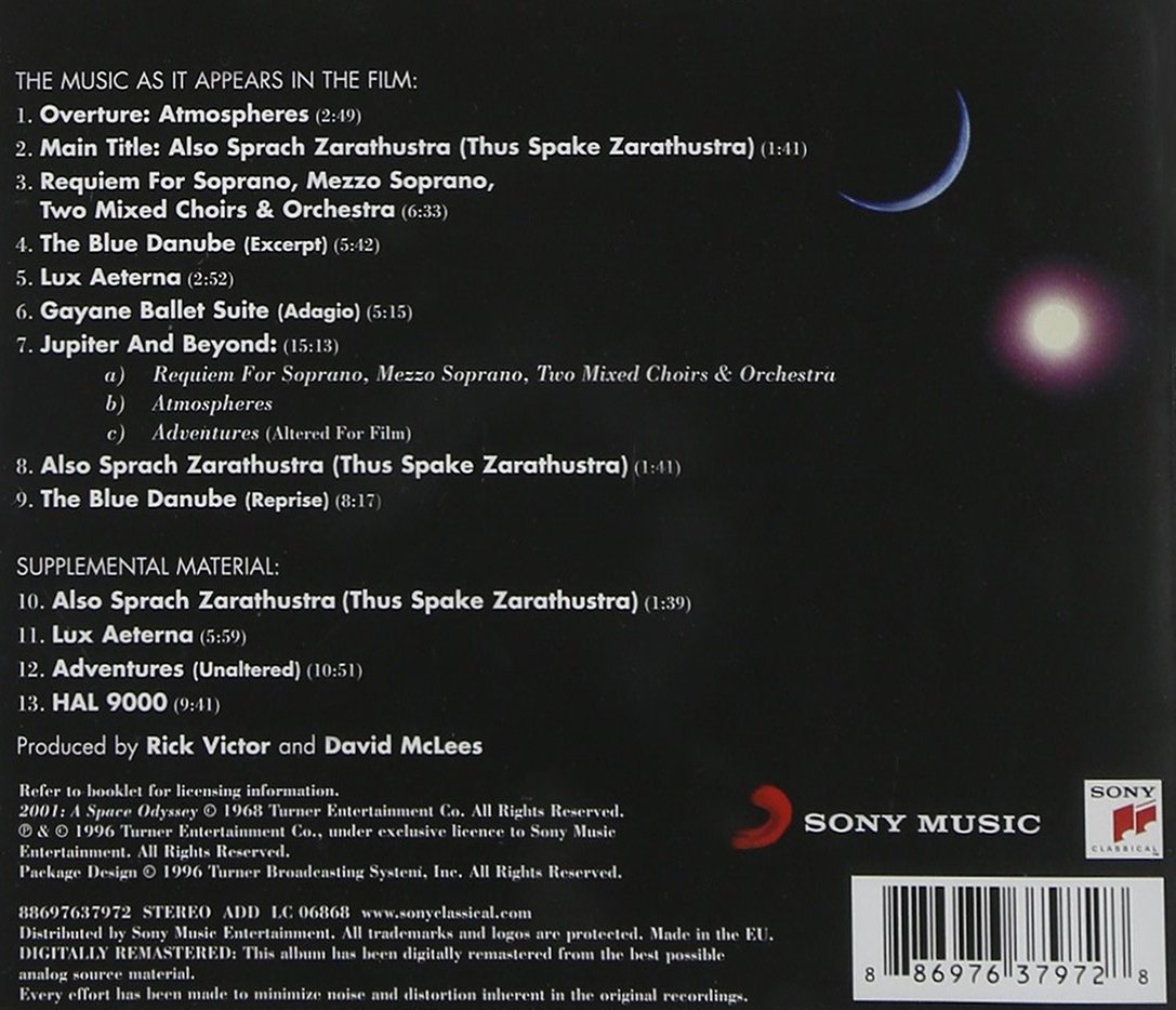 Out of print in the U.S.! Digitally remastered and expanded edition to the groundbreaking 1968 motion picture. 2001: A Space Odyssey was directed by Stanley Kubrick and written by Kubrick and Arthur C. Clarke. The film deals with thematic elements of human evolution, technology, artificial intelligence, and extraterrestrial life, and is notable for it’s scientific realism, pioneering special effects, ambiguous imagery that is open-ended to a point approaching surrealism, sound in place of traditional narrative techniques, and minimal use of dialogue. The soundtrack consists Classical favorites that add to the overall atmosphere of the legendary film. This edition includes the original music from the film plus edits of tracks that were on the initial soundtrack release added as bonus cuts. Sony.