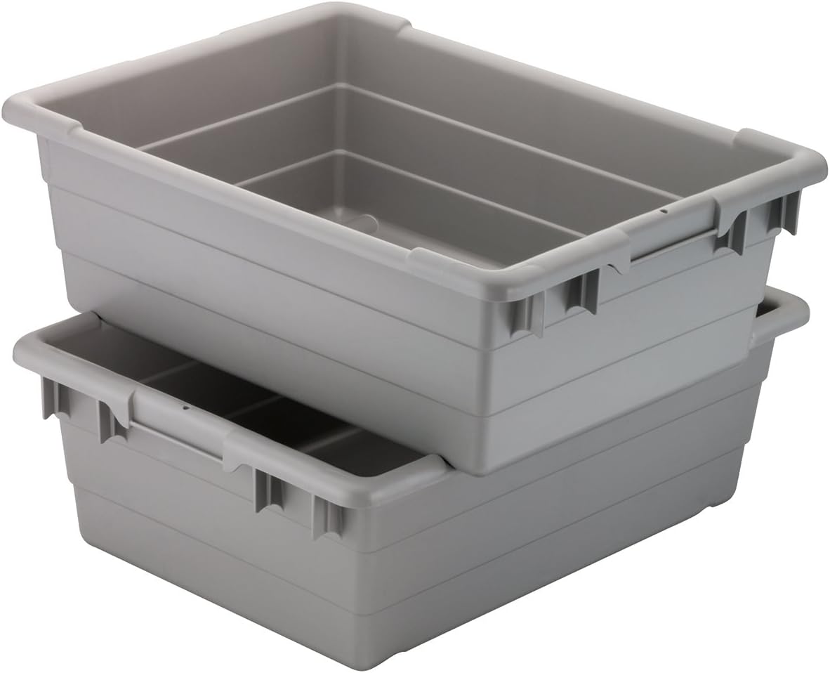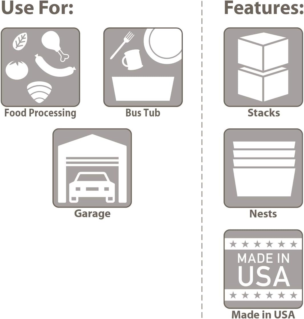 - EFFICIENT- Nests when empty. Stacking grooves allow sturdy 90-degree stacks of same size tubs. Tubs have molded-in handles for easy lifting