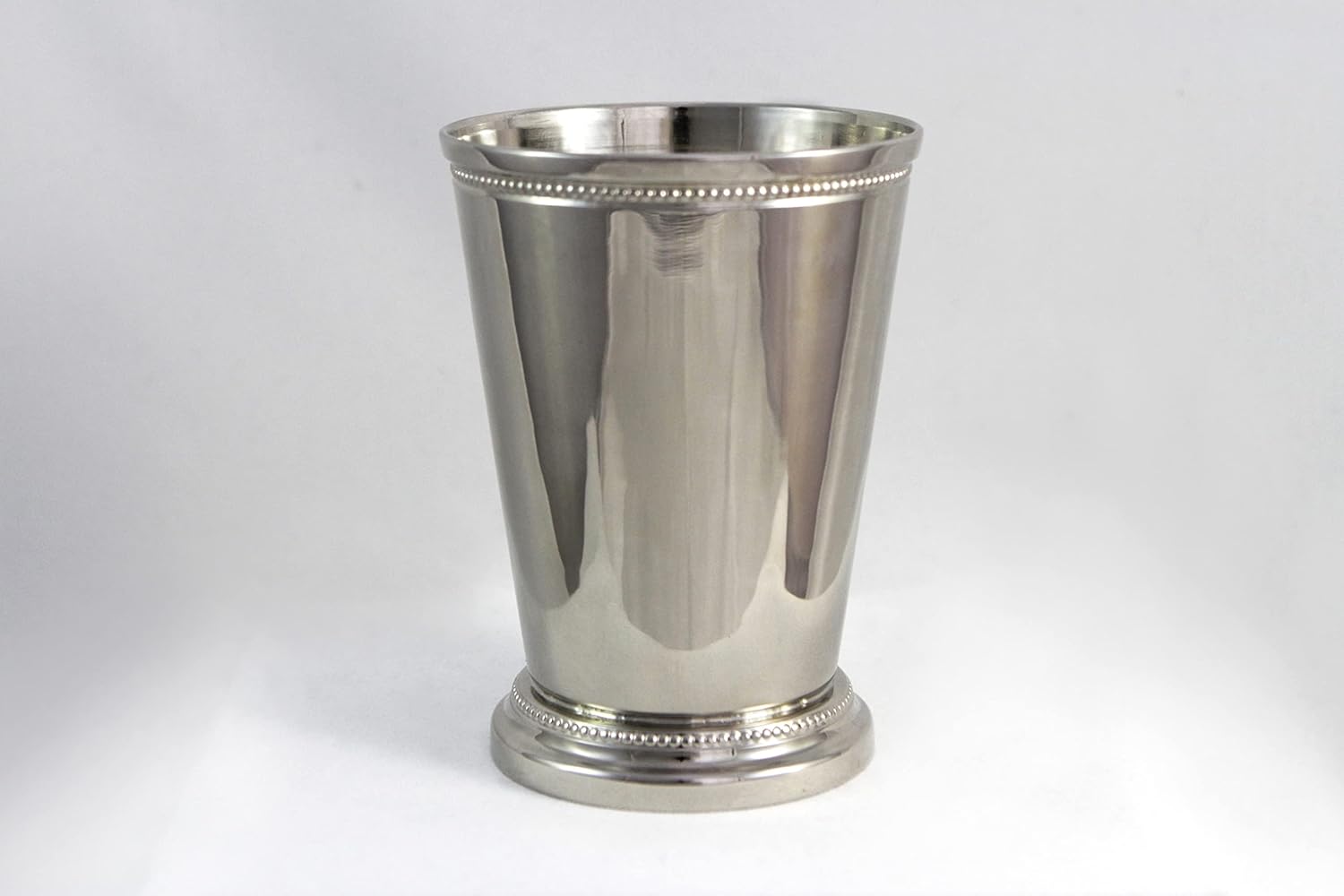 This elegant 12-ounce Mint Julep cup is made of solid nickel plate & ultra brass and is as elegant and fashionable as it is functional. The beaded edge adds to the beauty of the design. This beautiful and elegant cup keeps your drink chilled so your Mint Julep stays icy cold until the last drop.