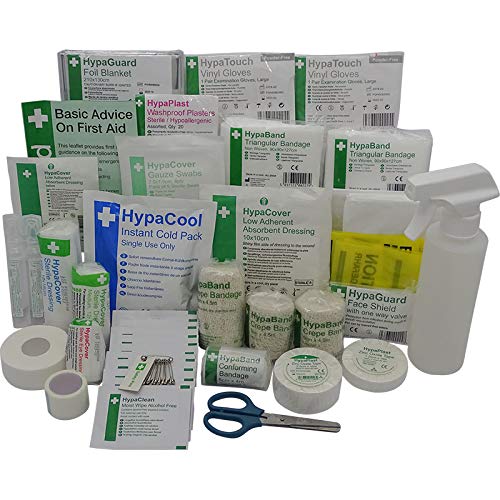 First Aid Guidance Leaflet 1, Sterile Dressings Assorted 2, Sterile Eye Dressing 1, Triangular Bandage 2, Conforming Bandage 7.5cm 1, Crepe Bandages Assorted 3, Allsport EAB 5cm 1, Microporous Tape 1, Disposable Gloves (Pair) 2, Low Adherent Dressings Assorted 2, Zinc Oxide Tapes Assorted 2, Moist Wipes 10, Eyewash Pods 20ml 2, Washproof Plasters 20, Flat Face Shield 1, Instant Cold Pack Standard 1, Self Seal Waste Bag 2, Foil Blanket 1, Scissors 1, Tigger Spray Bottle 1, Safety Pins 12, Gauze Swabs (8ply-7.5cm) 5