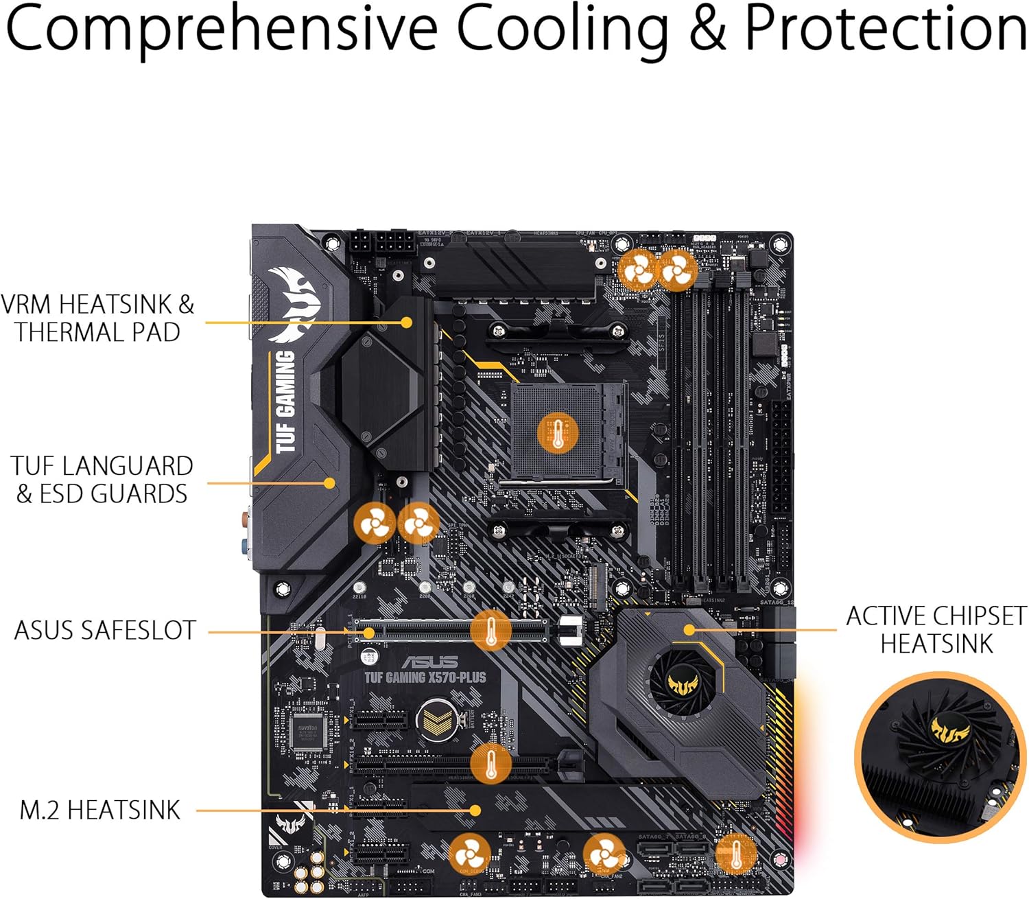 - Comprehensive Cooling: Active chipset heatsink, VRM heatsink, M.2 heatsink, hybrid fan headers and fan Xpert 4