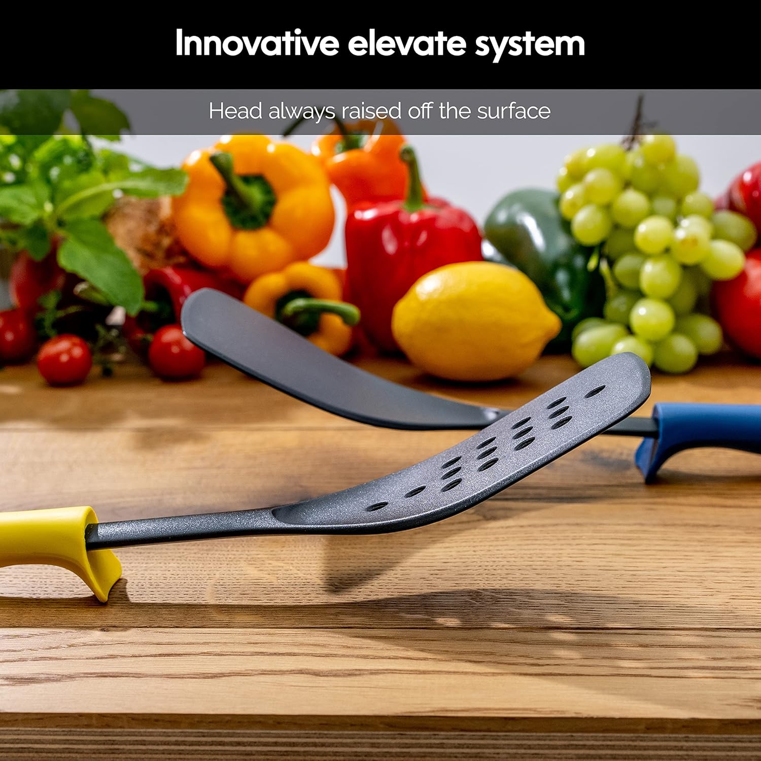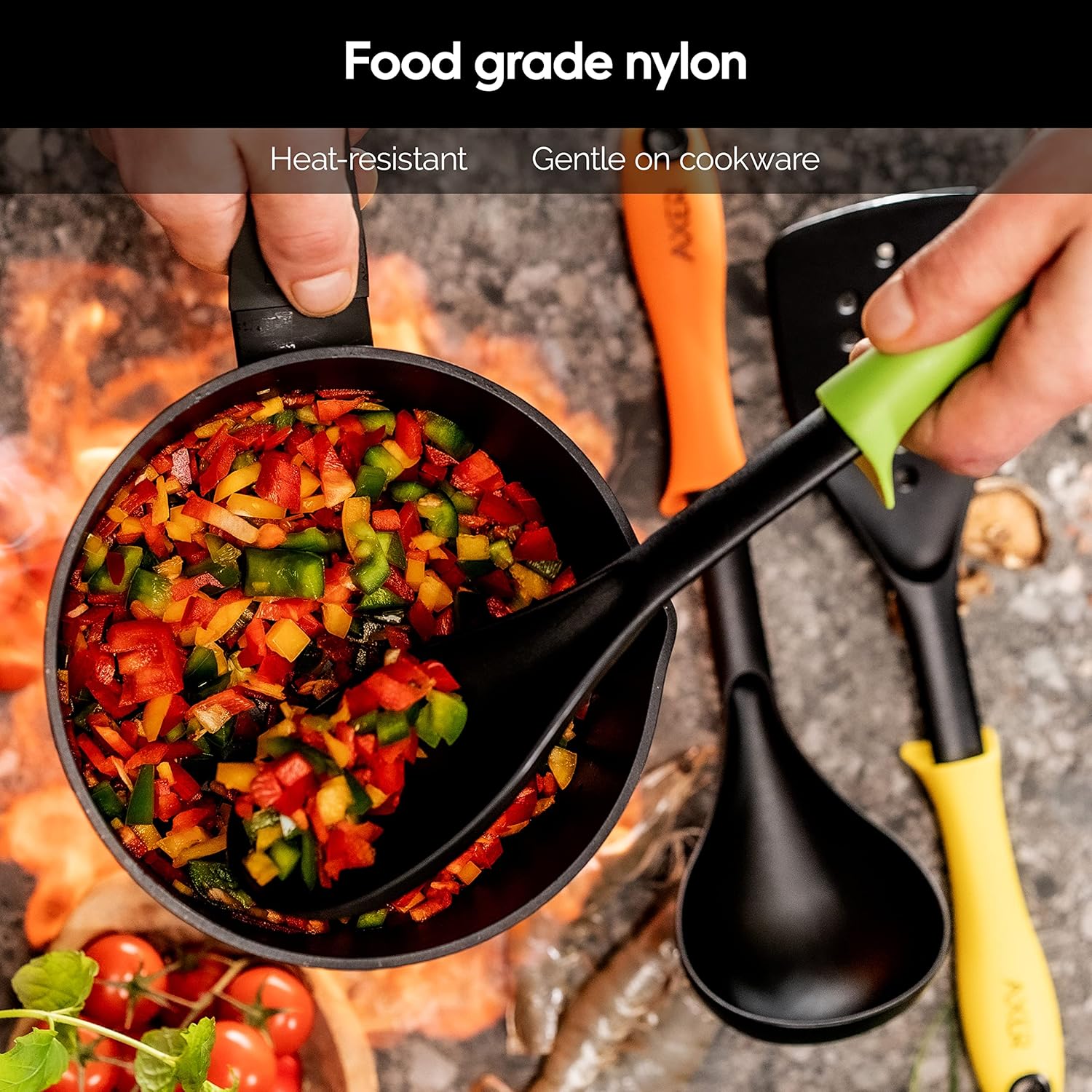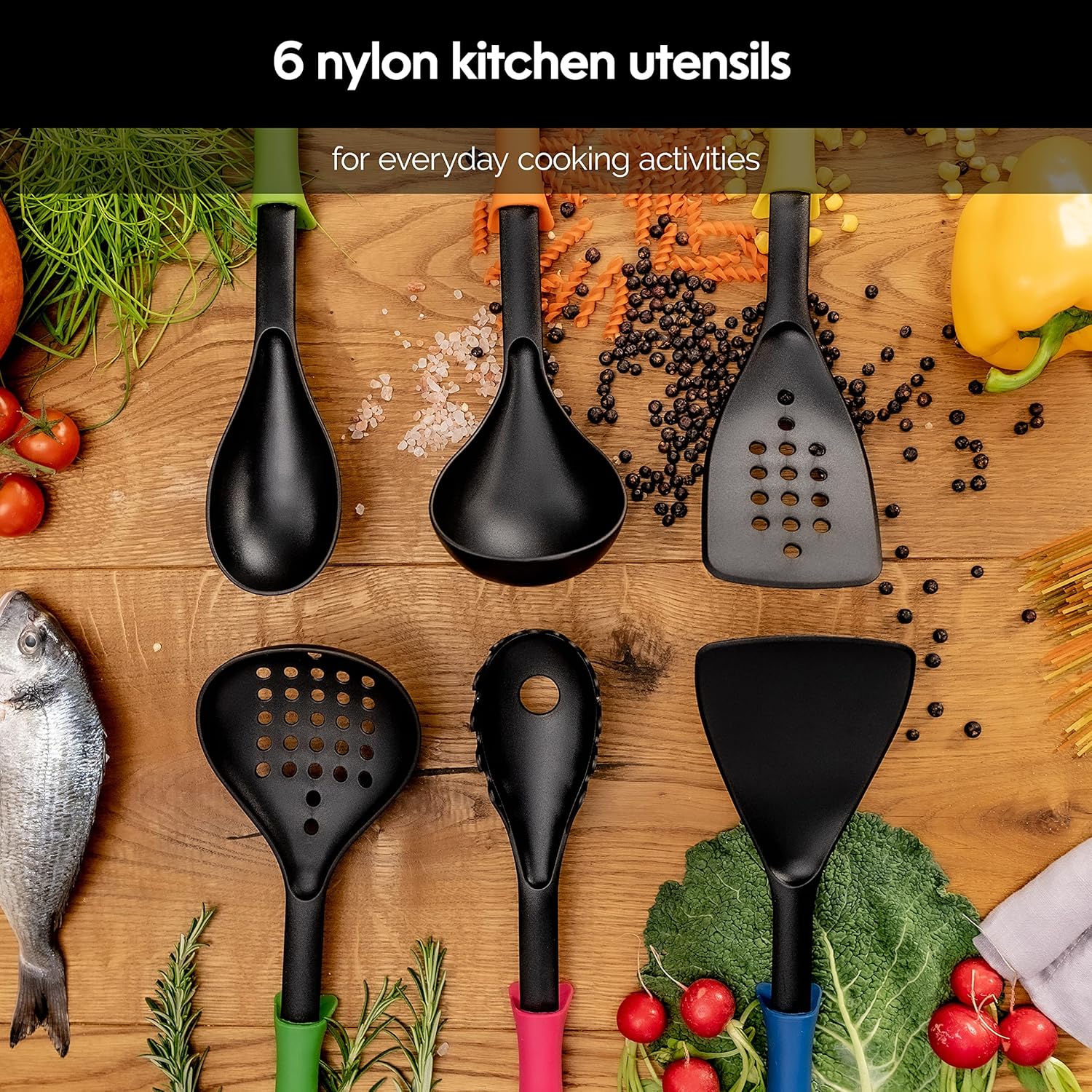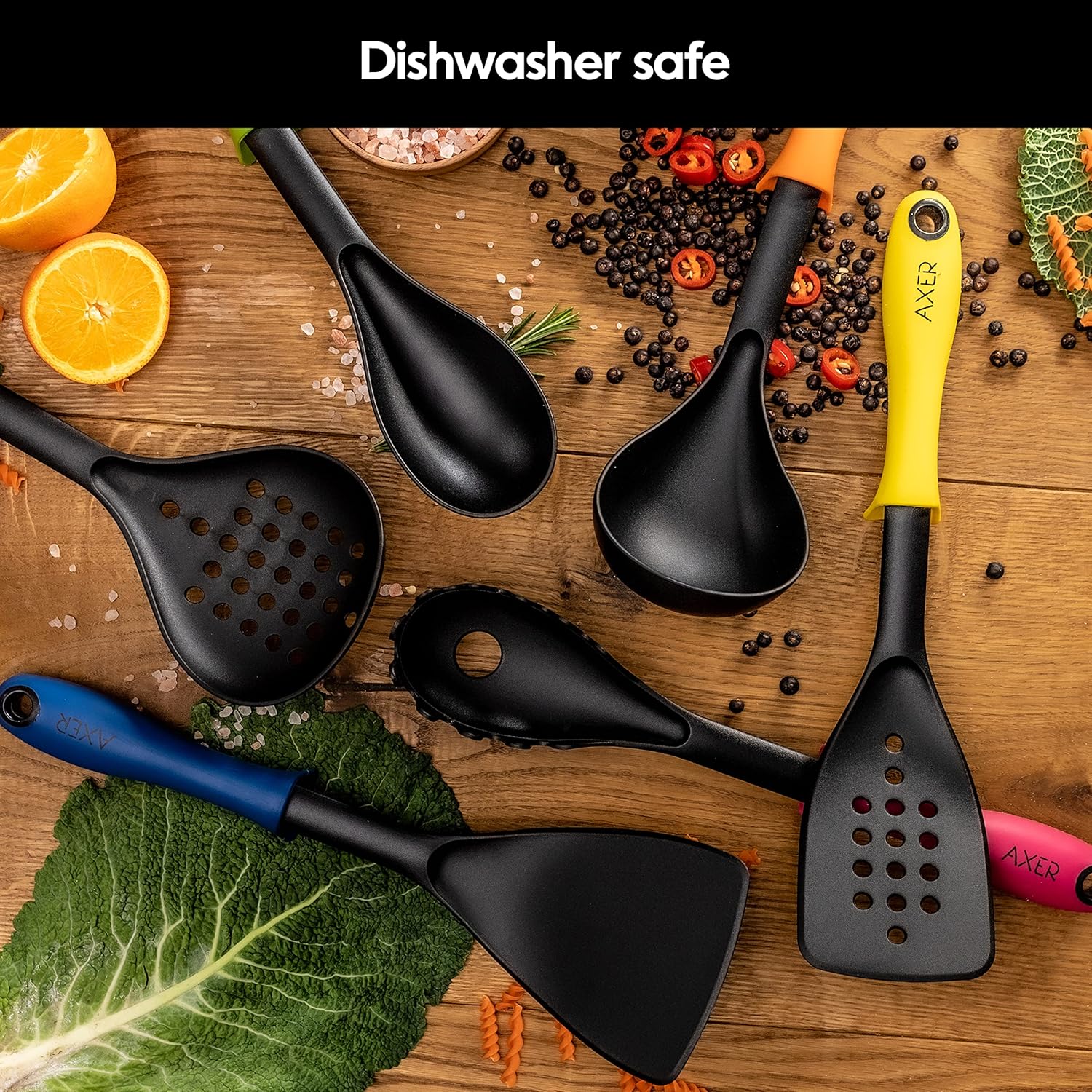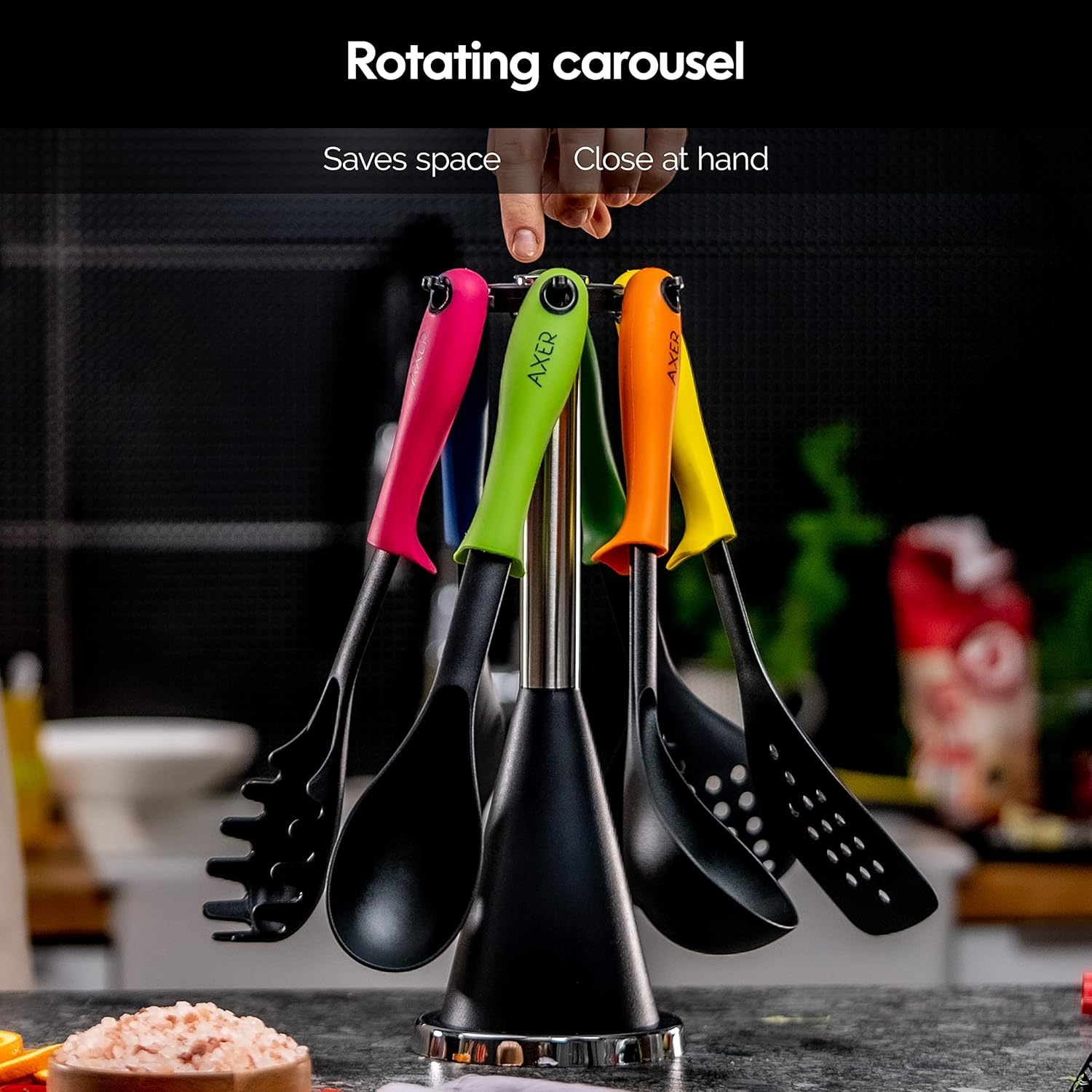 Axer Nylon Cooking Utensils Set with Rotating Stand & Elevated System – Multi-Colour Kitchen Set of 6 Cooking Tools – Include Spoon Ladle Skimmer Turner Spatula & Pasta Server – Dishwasher Safe