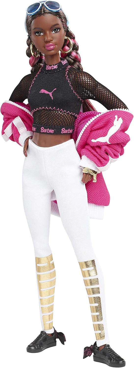 - Featured are PUMA branded leggings, a PUMA and BARBIE branded tank top with mesh sleeves and an oversized track jacket