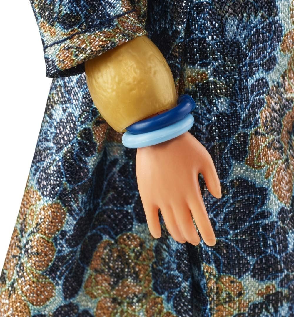 - The doll wears a floral-patterned brocade suit with striped blouse.