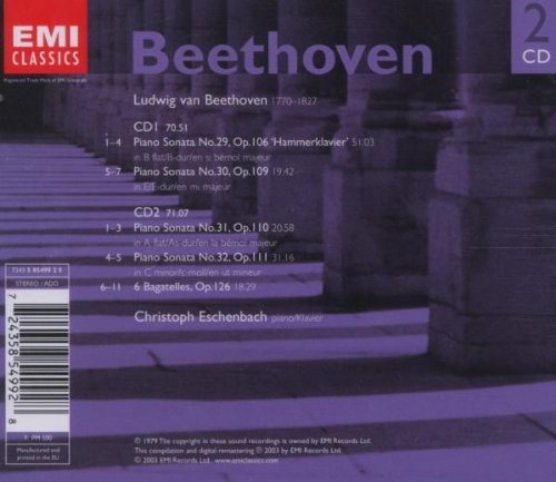 The Late Sonatas were some of Beethoven’s most difficult works and some of today’s most difficult repertoire. Yet again, his music found a new path. At this time, his Classical style and hearing completely vanished, replaced by the origins of Romantic music. The Hammerklavier was deemed to be Beethoven’s most difficult sonata yet. In fact, it was considered unplayable until almost 15 years later, when Liszt played it in a concert. The Bagatelles, Op. 126, dedicated to his brother Johann and published late in his career, in 1825, were his final work for piano. A bagatelle, in Beethoven’s usage, is a kind of brief character piece. Beethoven wrote to his publisher Schott that the Opus 126 Bagatelles “are probably the best I’ve written”. German pianist and conductor Christoph Eschenbach (born Breslau [now Wrocław], 1940) studied in Cologne and Hamburg with Hans Schmidt-Neuhaus and Eliza Hansen. In 1965 he was awarded first prize in the first Concours Clara Haskil in Switzerland, launching him on a successful concert career that has taken him to most parts of the world. As a pianist he plays a wide repertory ranging from the Baroque period to the 20th century; but it is for his carefully worked and poetic performances of Beethoven, Mozart, and Schubert that he is most highly regarded. He is a noted lieder accompanist and has performed frequently in a piano duo with Justus Frantz, with whom he has made distinguished recordings of works by Mozart and Schubert. In 1966 he made his recital and concert débuts in London and in 1968 he gave the première in Bielefeld of Henze’s Second Piano Concerto, written for him.