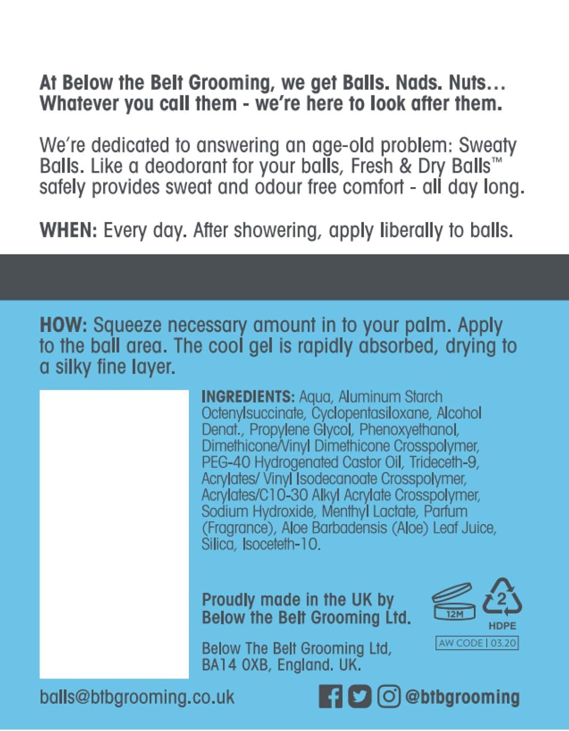 An everyday grooming essential, Fresh and Dry Balls is specifically formulated for the sensitive skincare needs of men below the belt. This freshening deodorant gel is easy to apply and rapidly dries to a silky finish. – Gentle formula for sensitive skin. – Dermatologically tested. – Talc free & paraben free. – Vegan & cruelty free. – Made in the UK. – Size 75ml. Cool fragrance is a blast of cooling mint with a citrus edge, to leave you feeling refreshed. To use: Apply after showering as part of your daily routine to keep your balls and groin fresh and comfortable for up to 8 hours. Also available in Oceanic Fresh, Aromatic Active and Fragrance-Free.