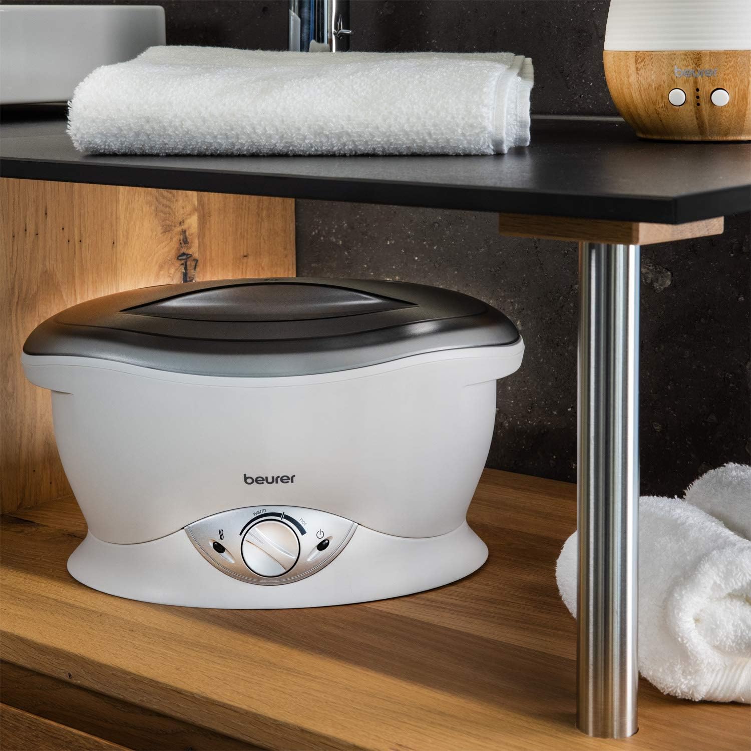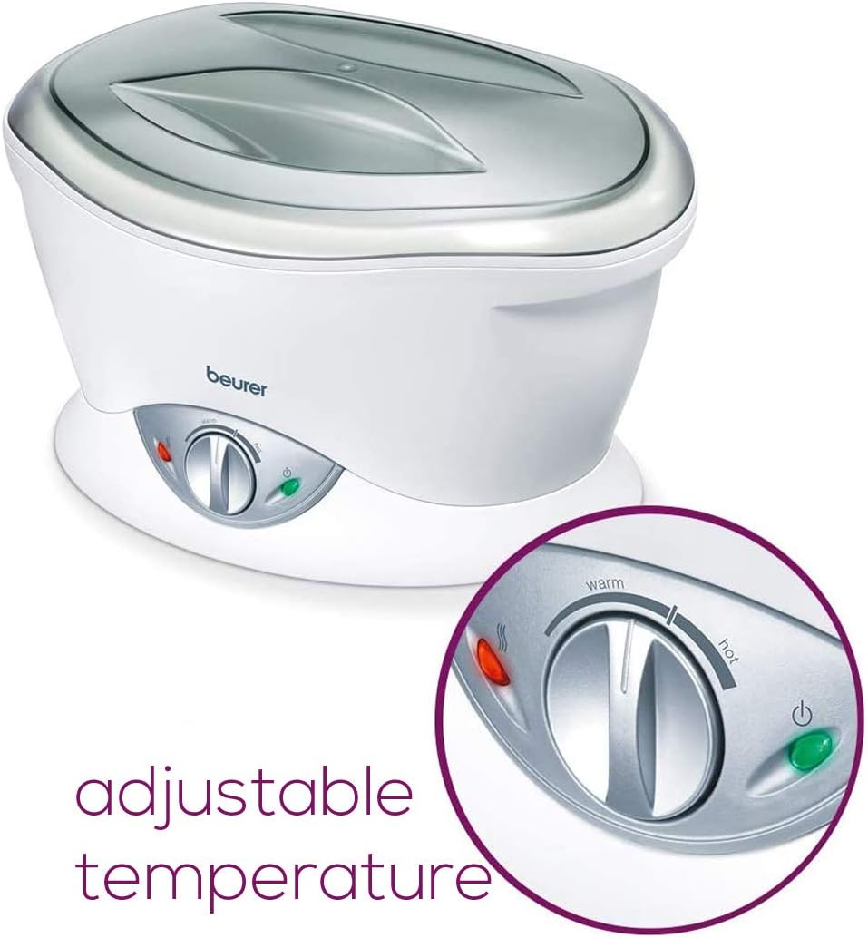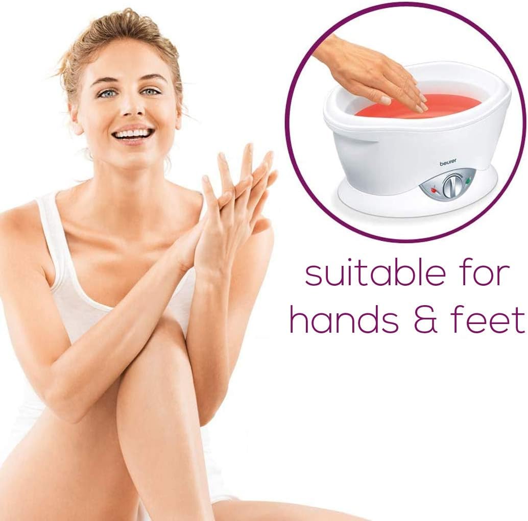 Smooth hands and gently manicured toenails are always eye-catching and contribute to an attractive appearance. The Beurer MP70 paraffin bath produces perfect salon-quality results for rough, dry or stressed skin. The skin is moisturised by the warm paraffin wax and the absorption of nutrients is promoted for smooth hands, feet and elbows. Blood flow is stimulated at the same time. You will achieve noticeably softer and more relaxed skin as well as visually attractive hands and feet for the perfect look. Condition the dry and rough skin on your hands, feet or elbows. Achieve perfect salon-quality results and an improved blood flow during an exposure time of only 20 minutes. The paraffin wax with a pleasant fresh orange scent is included – start using the Beurer Paraffin bath right away for beautiful and well-cared for hands and feet.