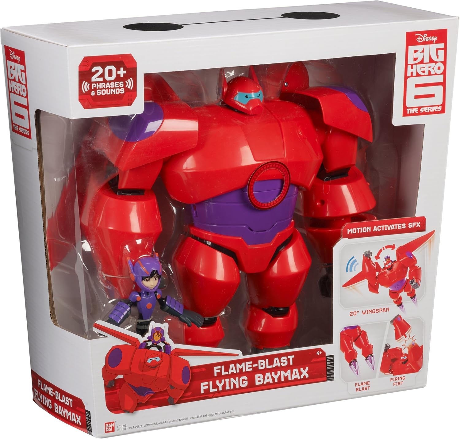 - FLAME BLAST BAYMAX WITH SOUND – this action figures a high flying toy with over 20 phrases and motion activated flight and battle sounds effects. Tilt Baymax to change flight sounds