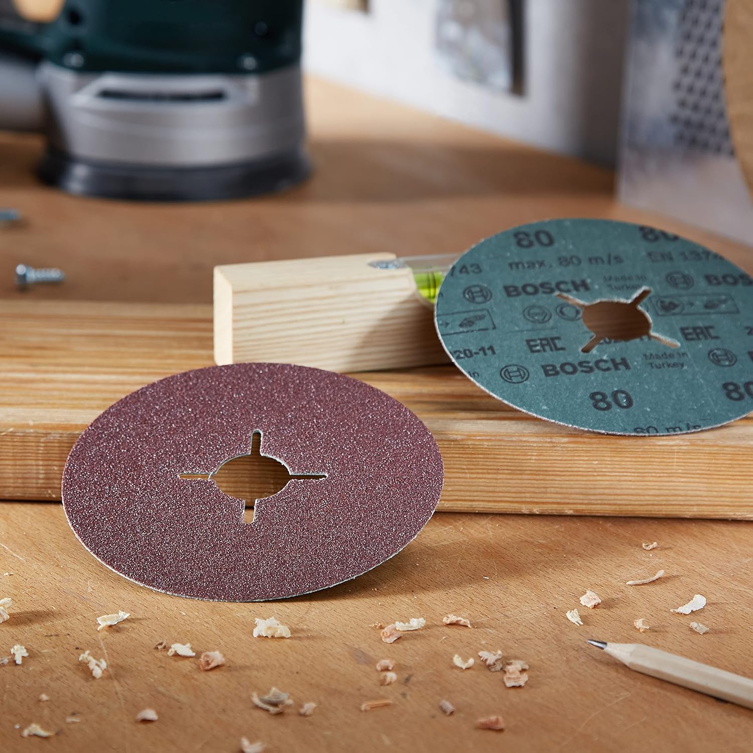 This is a Bosch 2609256246 fibre sanding disc for angle grinder, which is clamped for wood and metal, and its measurements are 115 mm disc, 22 mm bore and 80 grit. It is made of aluminium oxide on fully synthetic resin bond and v8 volcanic fibre. It has a high material removal rate and long lifetime. Bosch is a leading manufacturer of accessories for power tools and is an innovation leader with 125 years of tradition. Bosch’s aim is to develop innovative accessories for all applications, for more efficient working and for new materials. With more than 8000 products, Bosch offers the appropriate accessories for virtually all applications, users and all brands of power tools. Bosch provides high-quality universal sanding/polishing accessories.