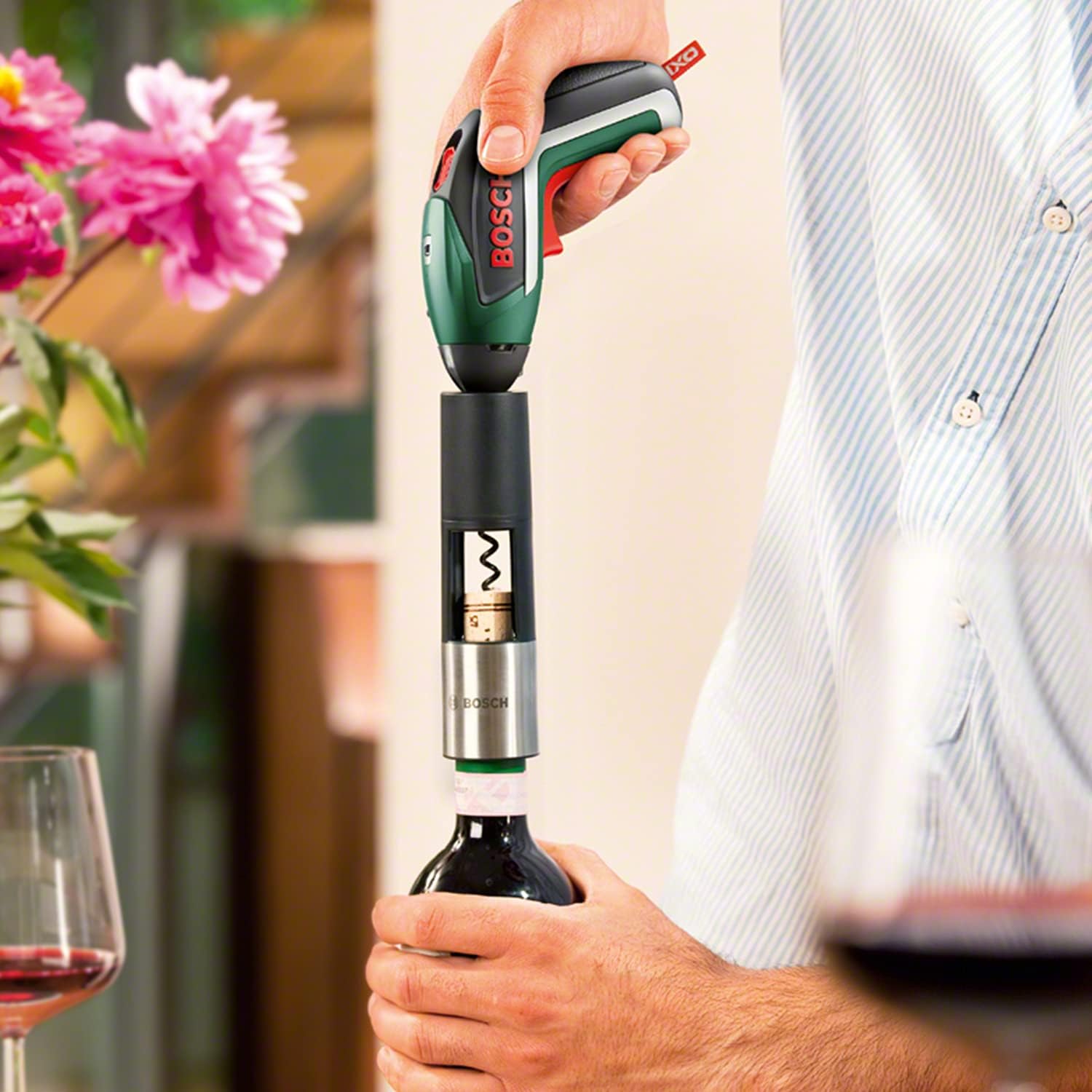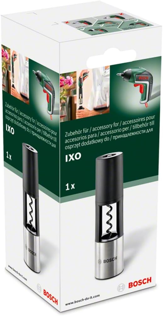 This corkscrew adapter for the IXO 3.6 Volt Lithium-Ion cordless screwdriver from Bosch makes it incredibly easy to open bottles of wine without the manual labour. About ten million Bosch IXOs have been sold, making it one of Europe’s most popular cordless screwdrivers. The IXO Vino adapter is on offer to celebrate this special occasion. The IXO Vino adapter demonstrates a stylish instinct for pleasure with its elegant pirouettes in cork. Just squeeze the trigger of your IXO and this compact cordless screwdriver will begin to deliver its performance, opening any good wine within seconds. After all, the first corkscrew with lithium-ion technology is not only handy, it’s also powerful.