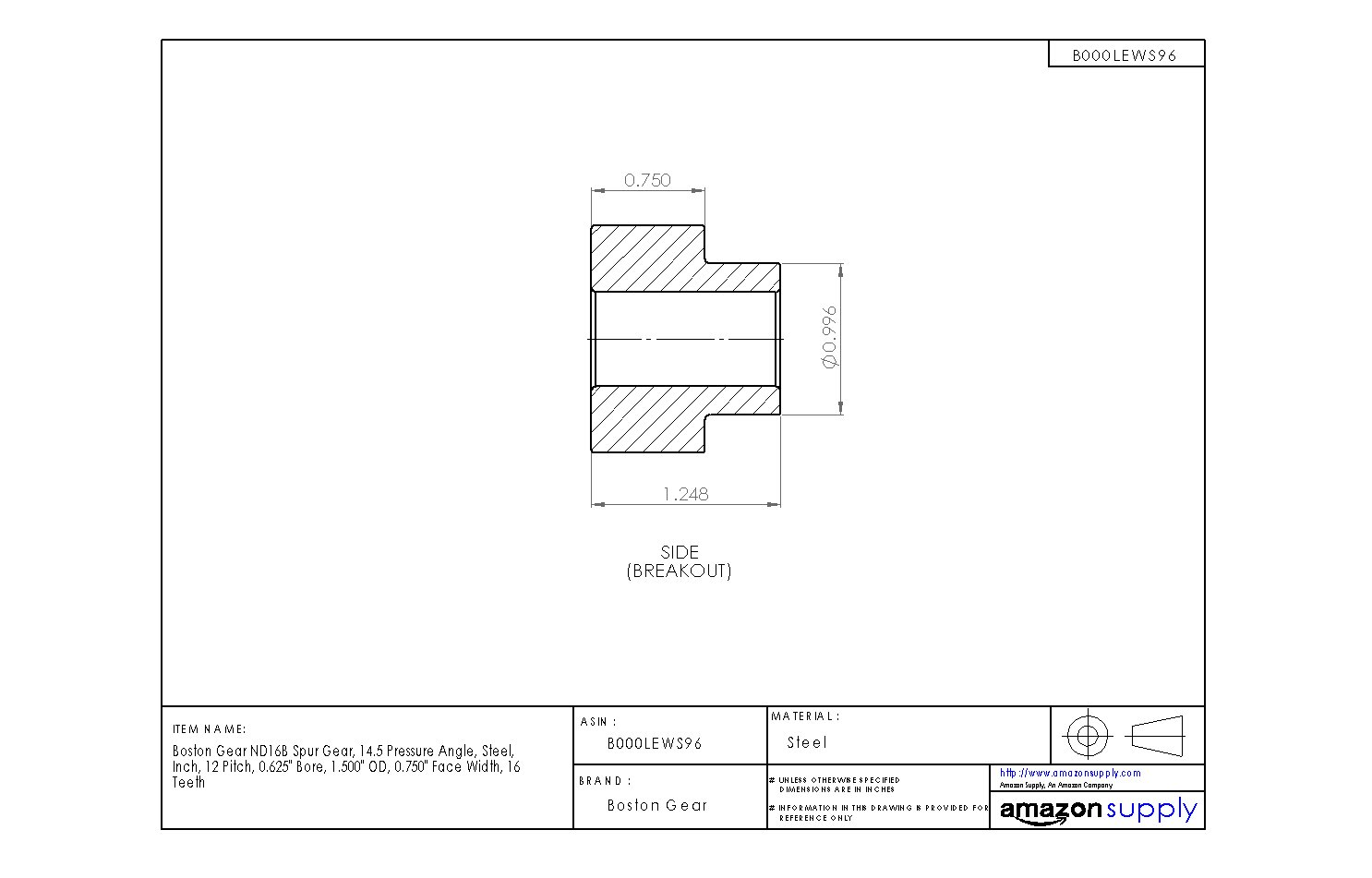 The Boston Gear low carbon steel spur gear with 14.5-degree pressure angle (PA) and a diametral pitch (DP) of 12 transmits torque between parallel shafts to provide rotational power to another part of a motorized system. It has a 14.5-degree pressure angle for a higher contact ratio between gears than larger pressure angles, resulting in quieter operation, and a 12-diametral pitch for applications requiring a balance between transferring torque and controlling changes in speed and direction of rotation with precision. This spur gear, which can mesh only with spur gears that have the same pressure angle and diametral pitch, is made of low carbon steel (.2 percent carbon) for applications where the hardness and strength of higher levels of carbon are not needed to transmit torque and motion. This Boston Gear spur gear is suitable for use in a variety of commercial and industrial applications, such as construction equipment, aeronautics, conveyors, and manufacturing equipment, among others.