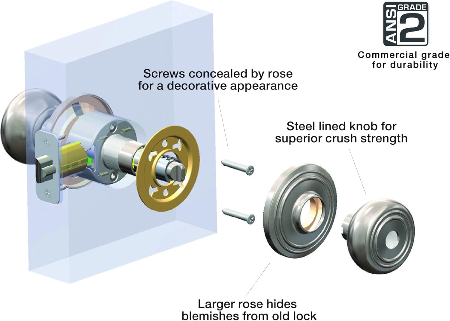- EASY TO INSTALL: Fits all standard doors, just a Phillips screwdriver is required for installation. Each lock has hidden screws, 3” diameter roses to hide blemishes from old hardware, & removable interior knobs or levers for scratch-free set-up