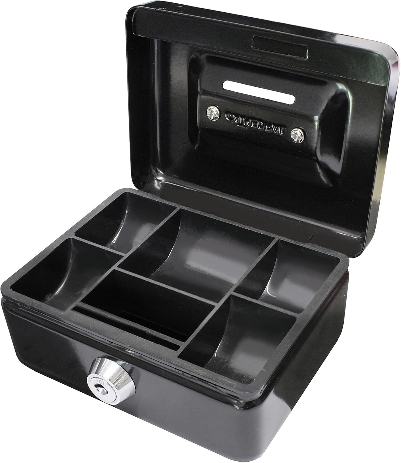 - Steel design with powder coated black paint and secure lock with two keys,size:6 X 9.5 12.5 H D W (cm). The internal dimensions (with tray out) are 5 x 11.8 x 9 cm