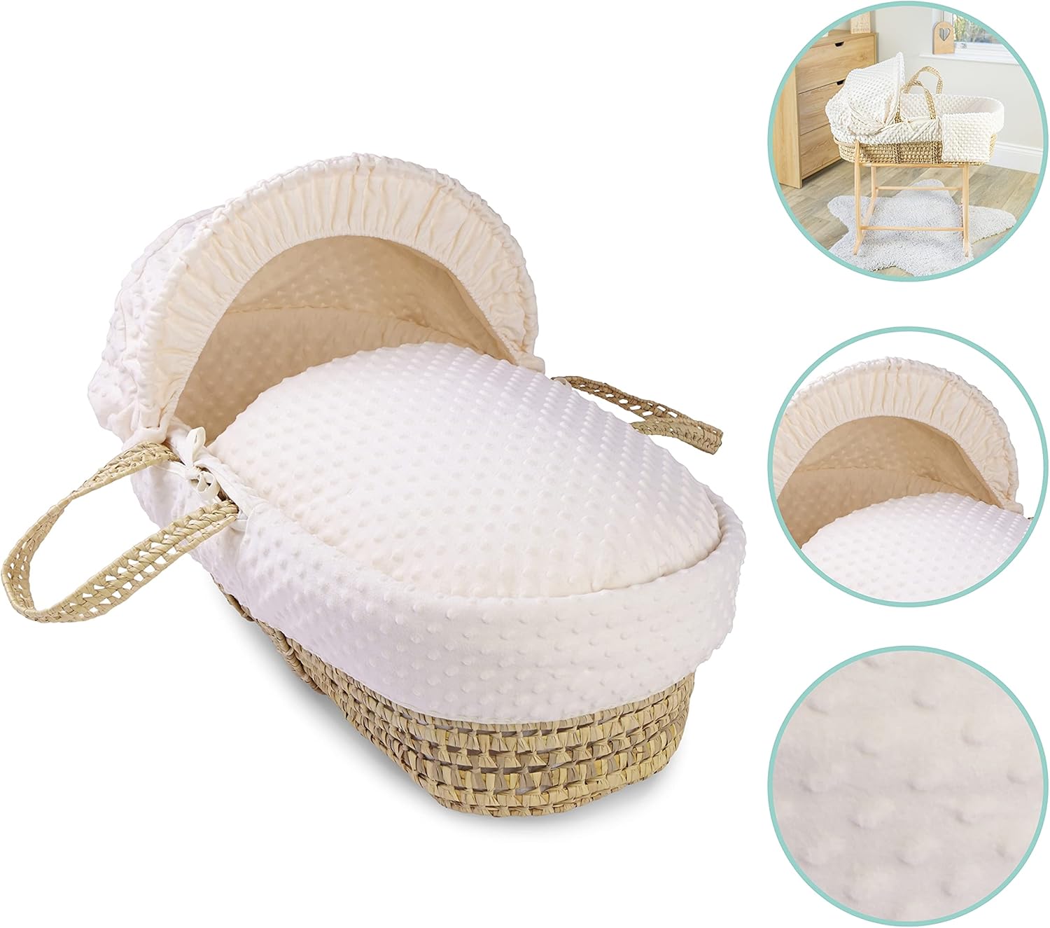 This beautiful Moses basket is made from soft, floaty fabric and will complete any nursery perfectly. The Moses basket quilt/coverlet is reversed with a soft knitted jersey fabric for the ultimate comfort for your baby. Suitable from birth to a maximum weight of 9 kg (or until baby begins to roll over, pull themselves up or sit unaided). Comes complete with an adjustable, removable hood, padded liner that covers the interior walls of the basket, two carry handles, coverlet, and a firm, foam mattress.