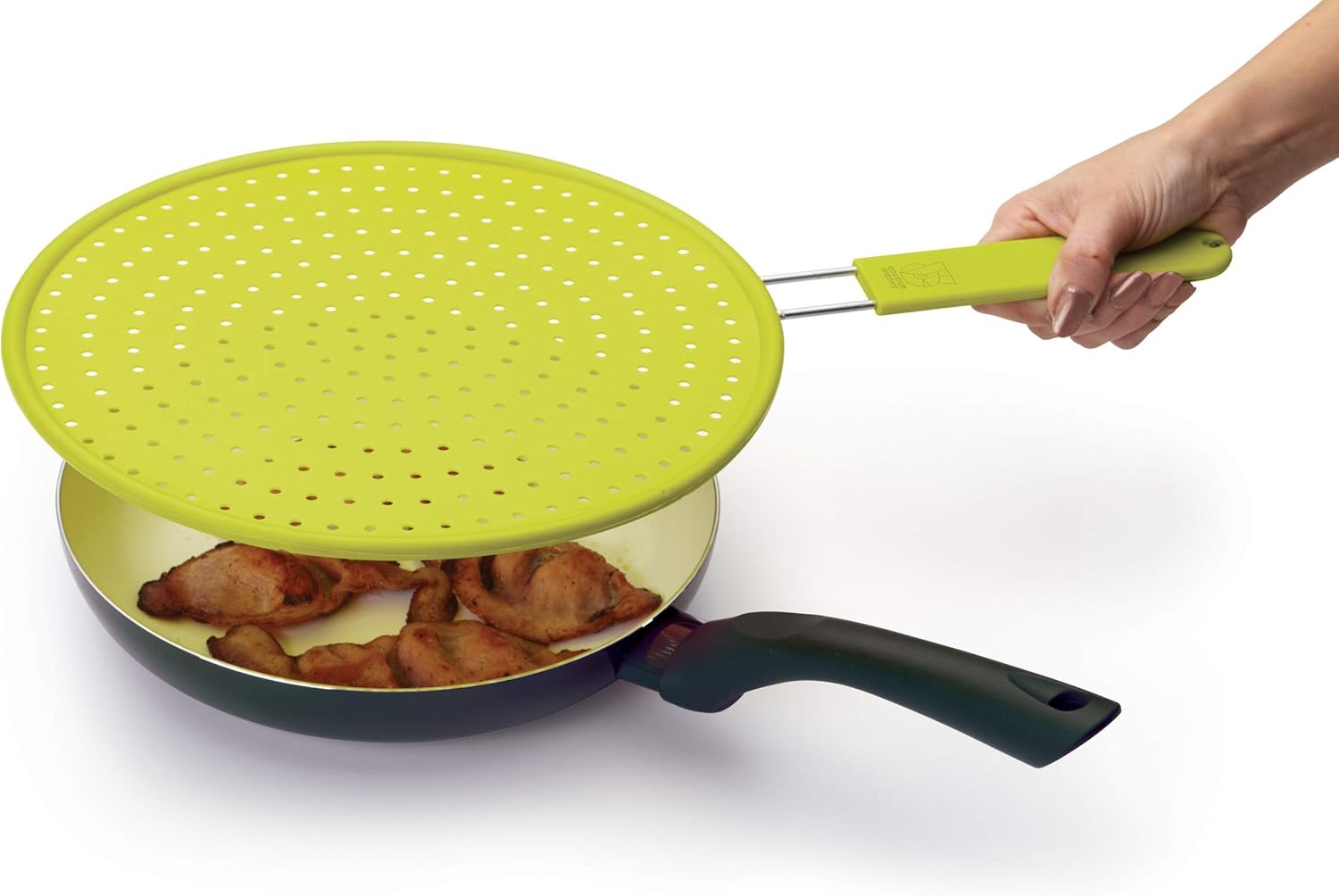 The Kitchen Craft Colour works Green Silicone Splatter Screen provides the perfect barrier against hot spatters of oil, fat and boiling water from pans and woks. Whether you’re frying burgers in a griddle pan or boiling vegetables in a saucepan, it prevents stovetops and work surfaces from becoming marked, as well as protecting you from burns. It’s heat resistant to temperatures as high as 260 degrees Celsius / 500 degrees Fahrenheit, so it can cope with anything cooking related. This silicone splatter screen is perforated, so steam escapes safely, without a sudden surge as you uncover the pan. Made from silicone it’s very easy to keep clean. Lots of materials stain and absorb odours with use. Silicone doesn’t. So, you can fry anything from pans of fish, liver and onions to eggs – whether you hand wash it in warm water or pop it in your dishwasher, all the odours and stains wash away. With a sturdy and rigid stainless steel shank, the handle is also coated in heat resistant silicone, so the handle remains safe to touch whilst in use. It is also non-slip, easy grip so when you do pick it up, it offers a safe, secure grip. There is also an integrated hanging loop, so you can conveniently hang it up in your kitchen or pantry, rather than wrestling with it in a drawer. It’s also very versatile. The Colour works Green Silicone Splatter Screen can also be used for sifting, steaming and straining – thanks to its flat, perforated surface. And, what’s more, it comes with a five year guarantee. Combine your green silicone splatter screen with a variety of green silicone kitchen tools and accessories for complete coordination. Or experiment with the 10 other gorgeous tones, also available from the Kitchen Craft Colour works range. About Colour works The perfect blend of vibrancy and practicality, the Colour works range by Kitchen Craft features more than 400 essential kitchen tools, gadgets, knives and accessories in 11 vibrant colours. Don’t let the fun colours fool you, this is seriously high performance kitchen kit, designed to deliver incredible reliability on a daily basis. Using a variety of materials across the whole collection, including flexible LFGB grade, food-safe silicone, strong stainless steel, virtually unbreakable melamine and durable nylon, each product in our range provides fantastic performance whatever the cooking task.
