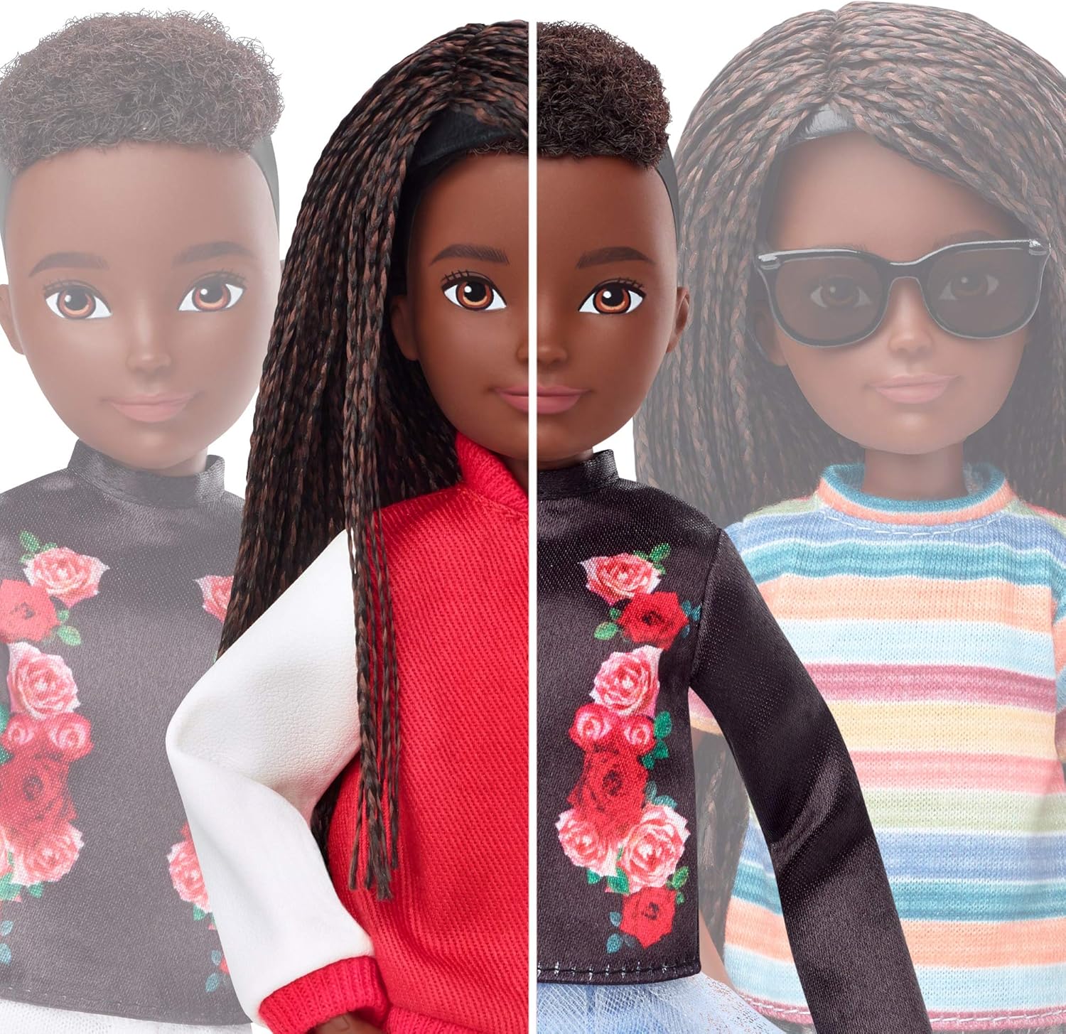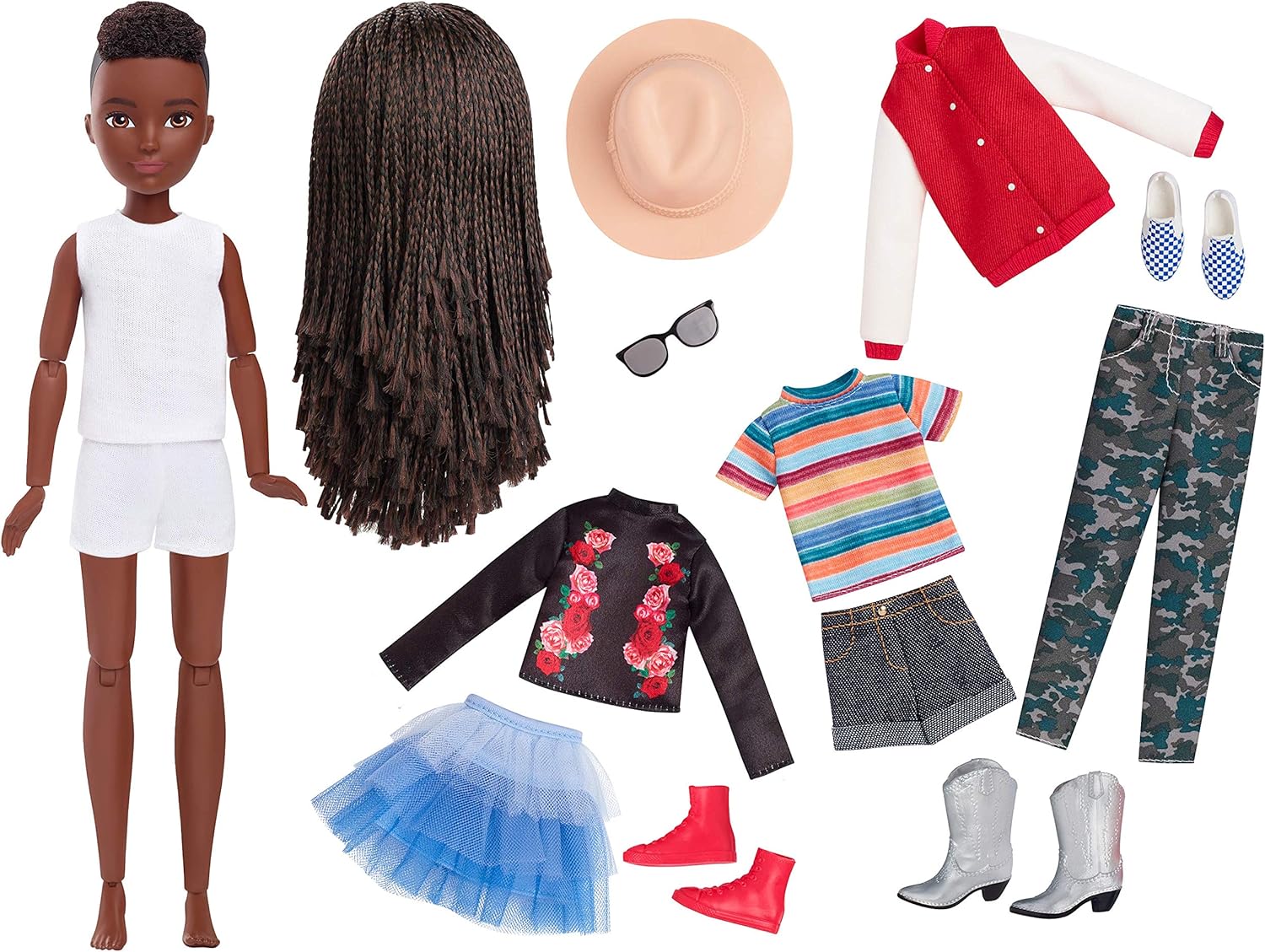 - The 11-inch (29.94-cm) doll has short, black, curly hair with shaved sides and wears a simple tank and shorts — offering a blank canvas so kids can make whoever they want!