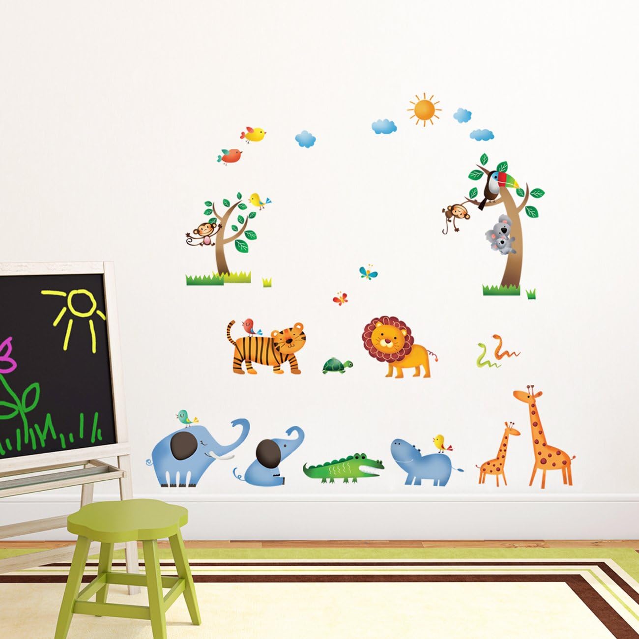 The Jungle Wall Stickers set is one of the cutest assortments of jungle animals including elephants, giraffes, tiger, lion, snakes, hippo, a couple of rambunctious monkeys, crocodile and other animals.