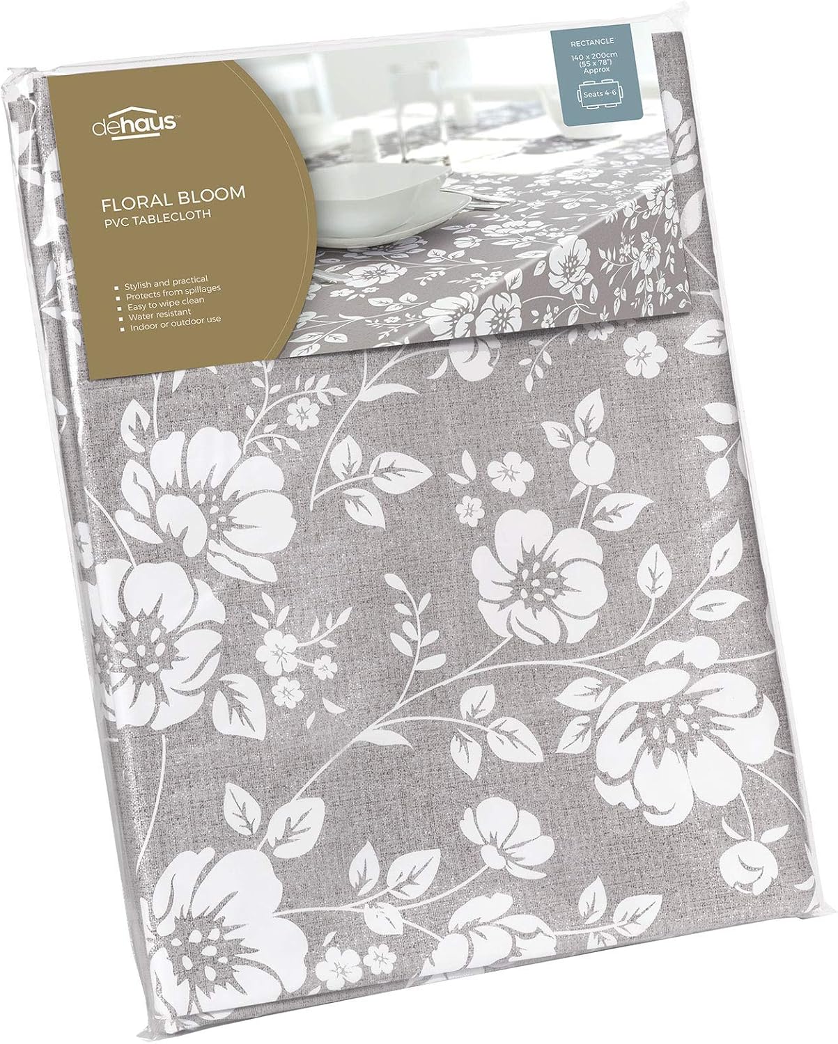 Dehaus® Wipe Clean Table Cloth – M Grey Floral Bloom | Wipe Clean PVC Oilcloth Table Cover | Rectangular Plastic Vinyl Tablecloth | Water Resistant & Easy to Clean | Kitchen or Dining Table Protector