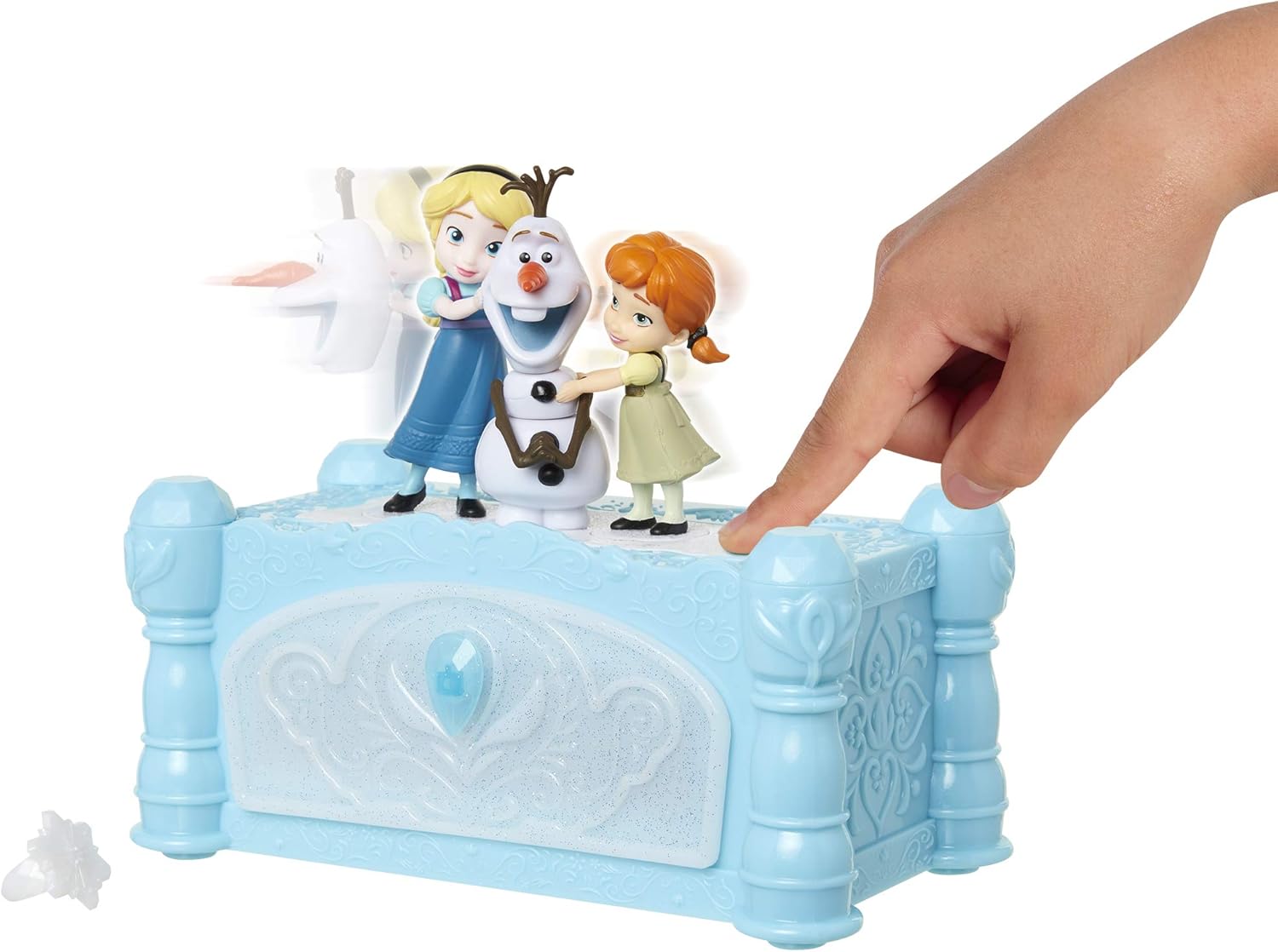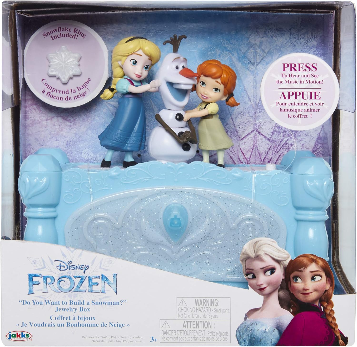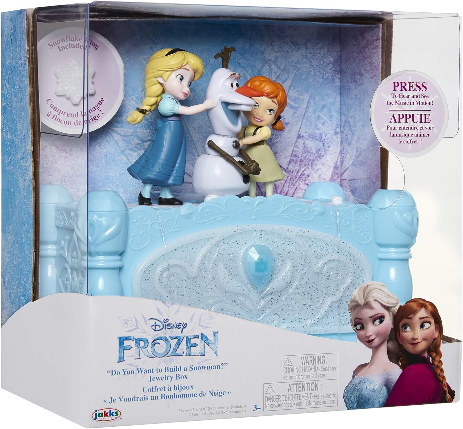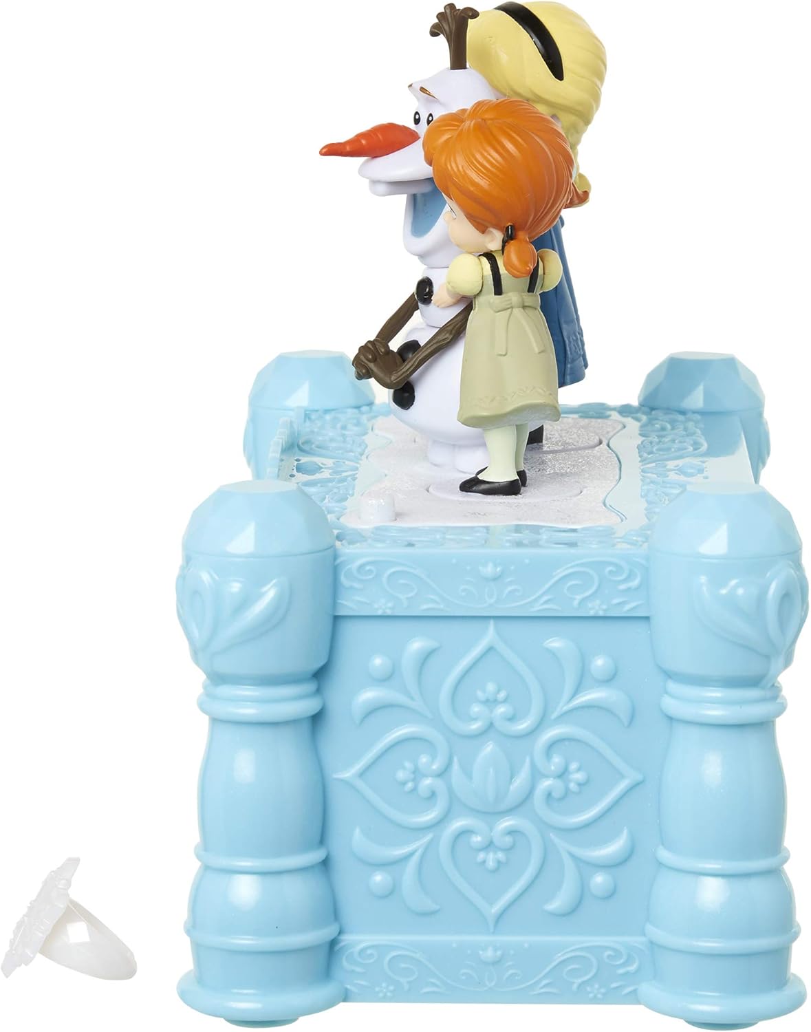 Now you can delight in wintertime fun all year round with the Disney Frozen "Do You Want To Build a Snowman?" Jewelry Box. Press the button and watch the heartwarming moment unfold as young Anna and young Elsa put Olaf together in time with the beloved Frozen song. Elsa holds his head and Anna holds his middle body section.