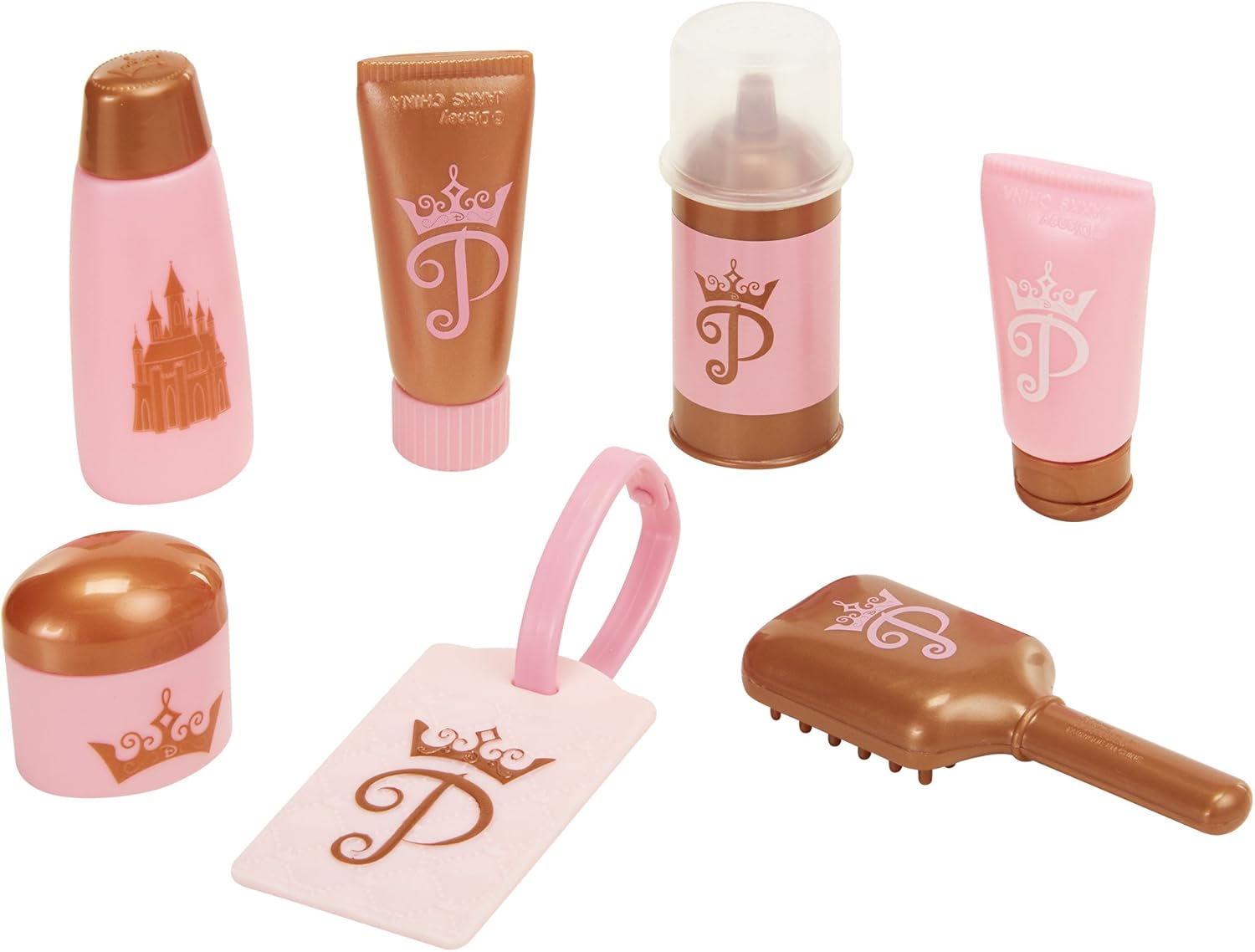 Includes travel size accessories: hairspray, moisturizer tube, conditioner bottle, shampoo bottle, powder bottle with lid, and hair brush.