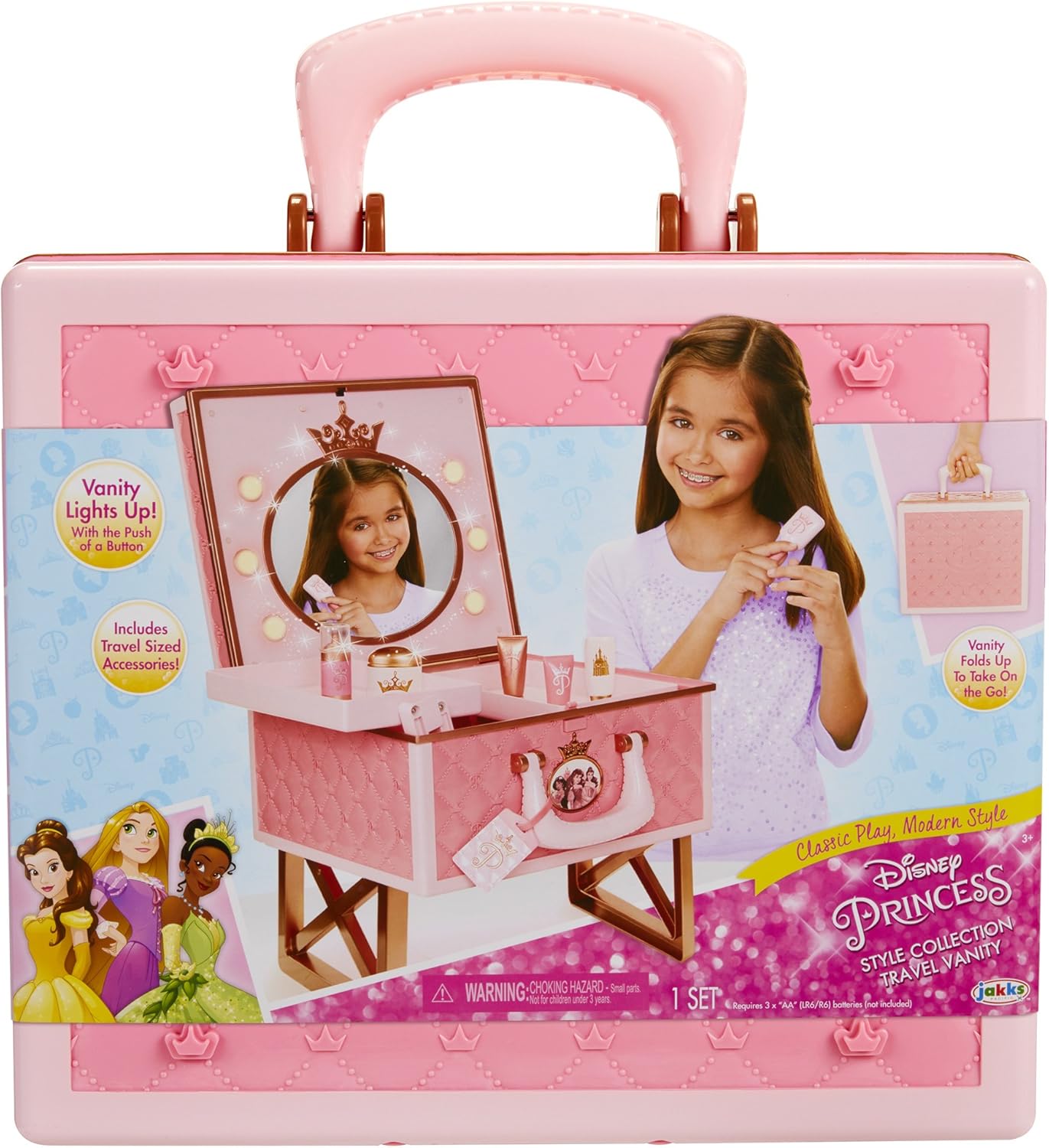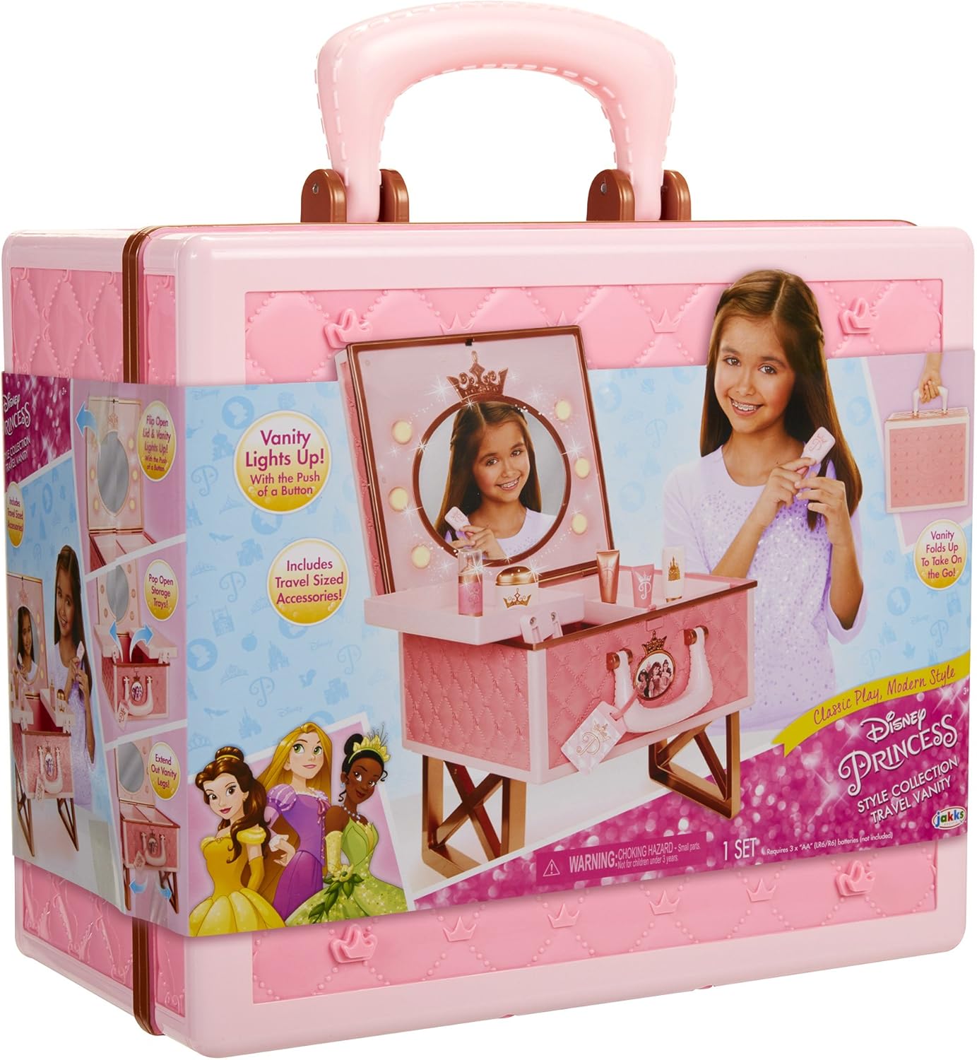 Sleek, unique, and oh so fun, the Disney Princess Style Collection, is meant for every modern girl with big goals and great style. This gorgeous vanity opens up to reveal a light up mirror, beauty accessories, and plenty of storage.