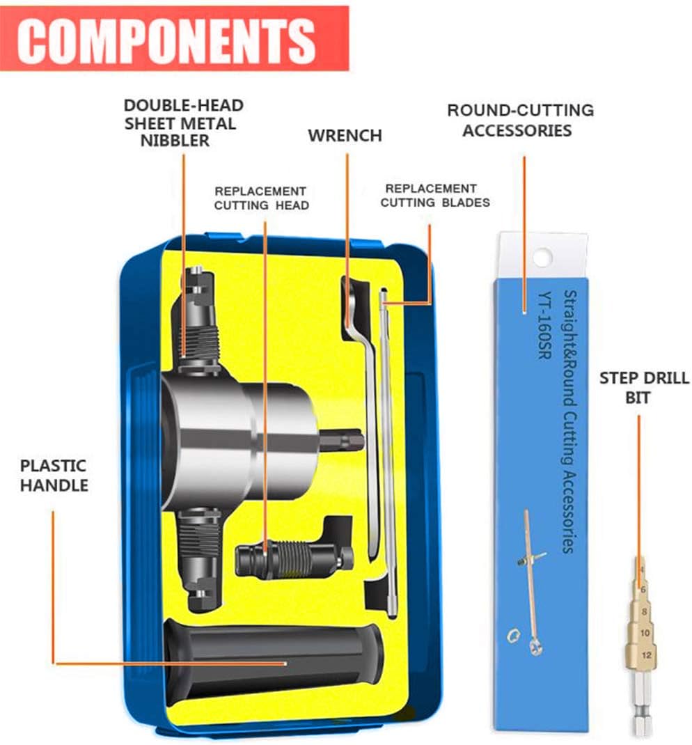 Double Head Sheet Nibbler Metal Cutter by Fujiwara, Drill Attachment Metal Nibbler Tool Kit with Wrench and Extra Nibbler Parts (8 Pcs Set, Iron Tool Box) (8Pcs Set)