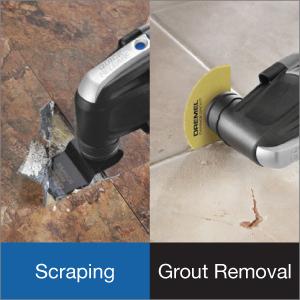 Scraping accessories are best suited for material removal when your project involves new flooring or bath installation. Use the rigid scraper blade for removing stuck vinyl flooring, carpeting and carpet pad. For removing old caulk around the tub or shower, use the flexible scraper blade. Dremel also makes grout removal fast and easy with a grout removal blade. Available in 1/8 inch size and 1/16 inch size.