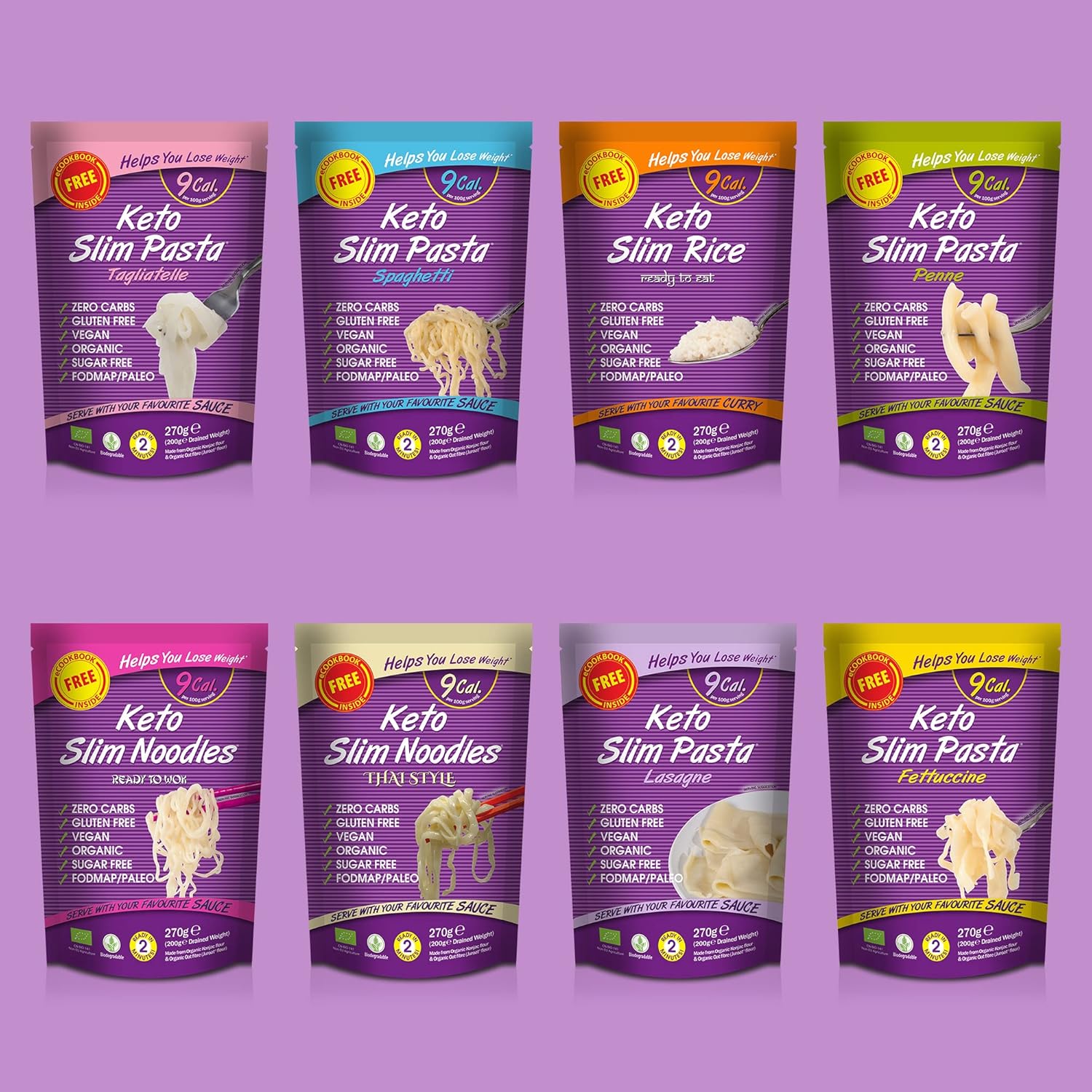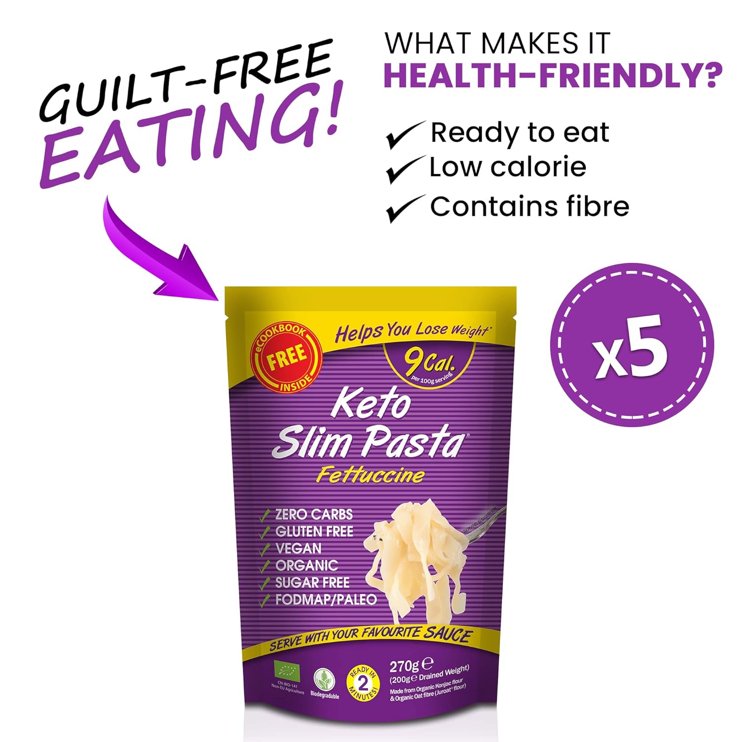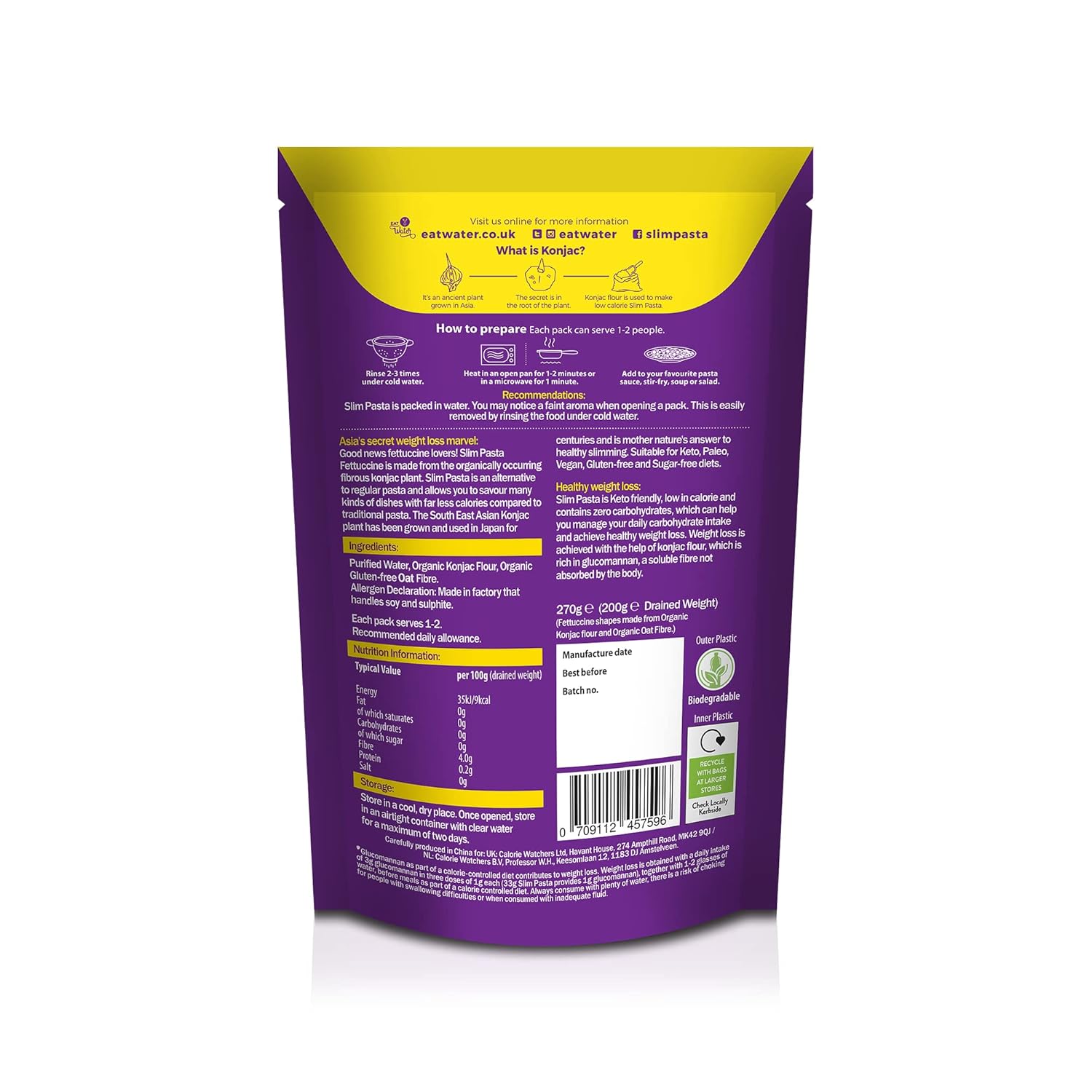 Eat Water Slim Pasta Fettuccine is made from Moyu (Konjac), a natural vegetable fibre that the body doesn’t absorb. It is the first European approved Fettuccine in the UK and Ireland for Weight Loss. It is gluten-free and the first of its kind to be listed with Coeliac UK and Coeliac Society of Ireland. Slim Pasta Fettuccine contains only 7.7 calories, which comes from the fibre. Slim Pasta Fettuccine contains 0g of carbohydrates and 0g of sugar per serving, making it a great alternative for diabetics too.