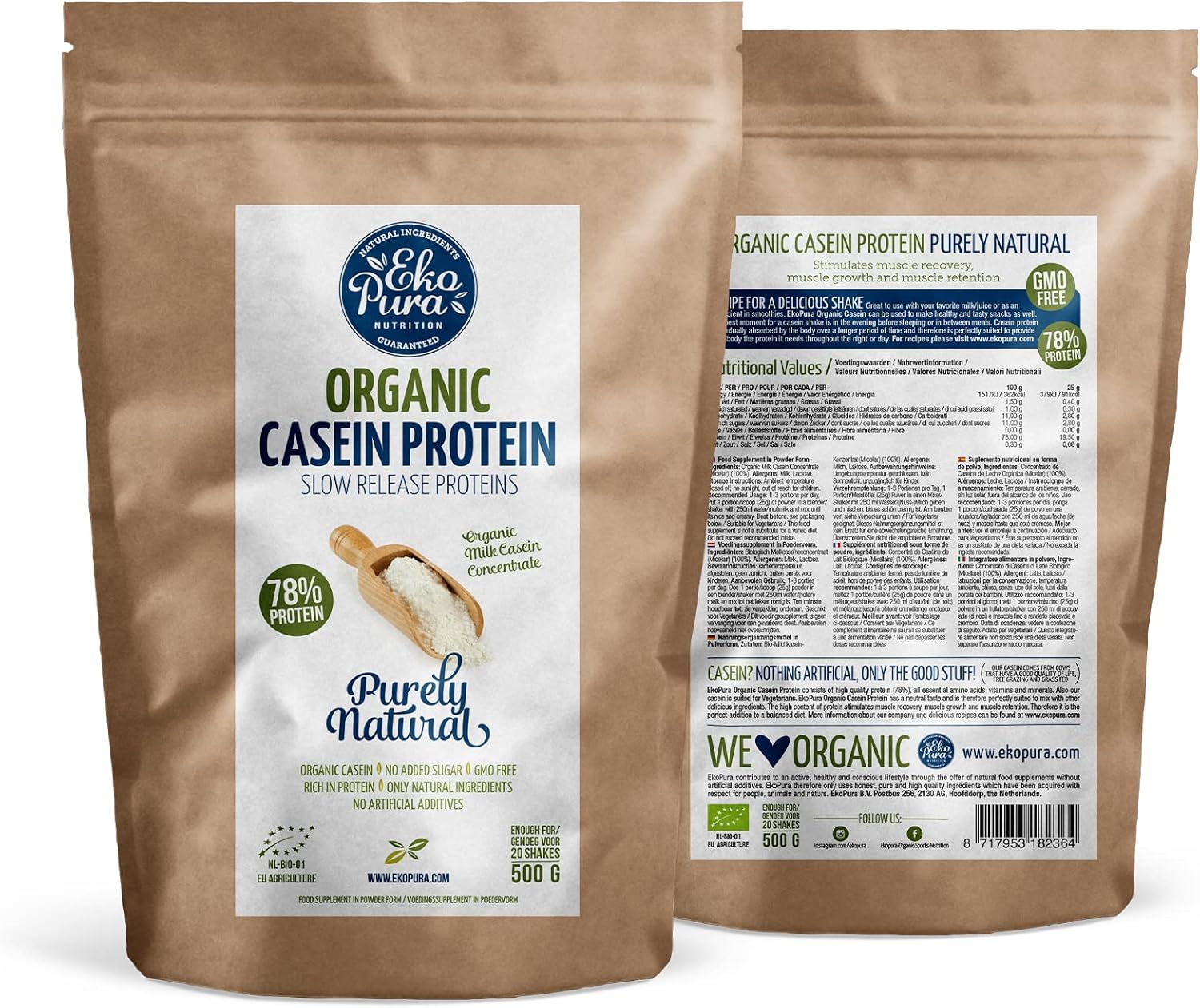 Organic Casein by EkoPura contains 78% protein and is the perfect solution for gradual protein intake by the body over a longer period of time. Casein protein is therefore perfectly suited to consume before sleeping, at breakfast or as an in between snack to maintain protein intake during the night or day. EkoPura Organic Casein is certified organic, free from artificial additives, is derived from milk from happy grass fed cows, full of antioxidants and contains all essential amino acids (BCAA’s). Ideal for muscle recovery, muscle growth and muscle retention.