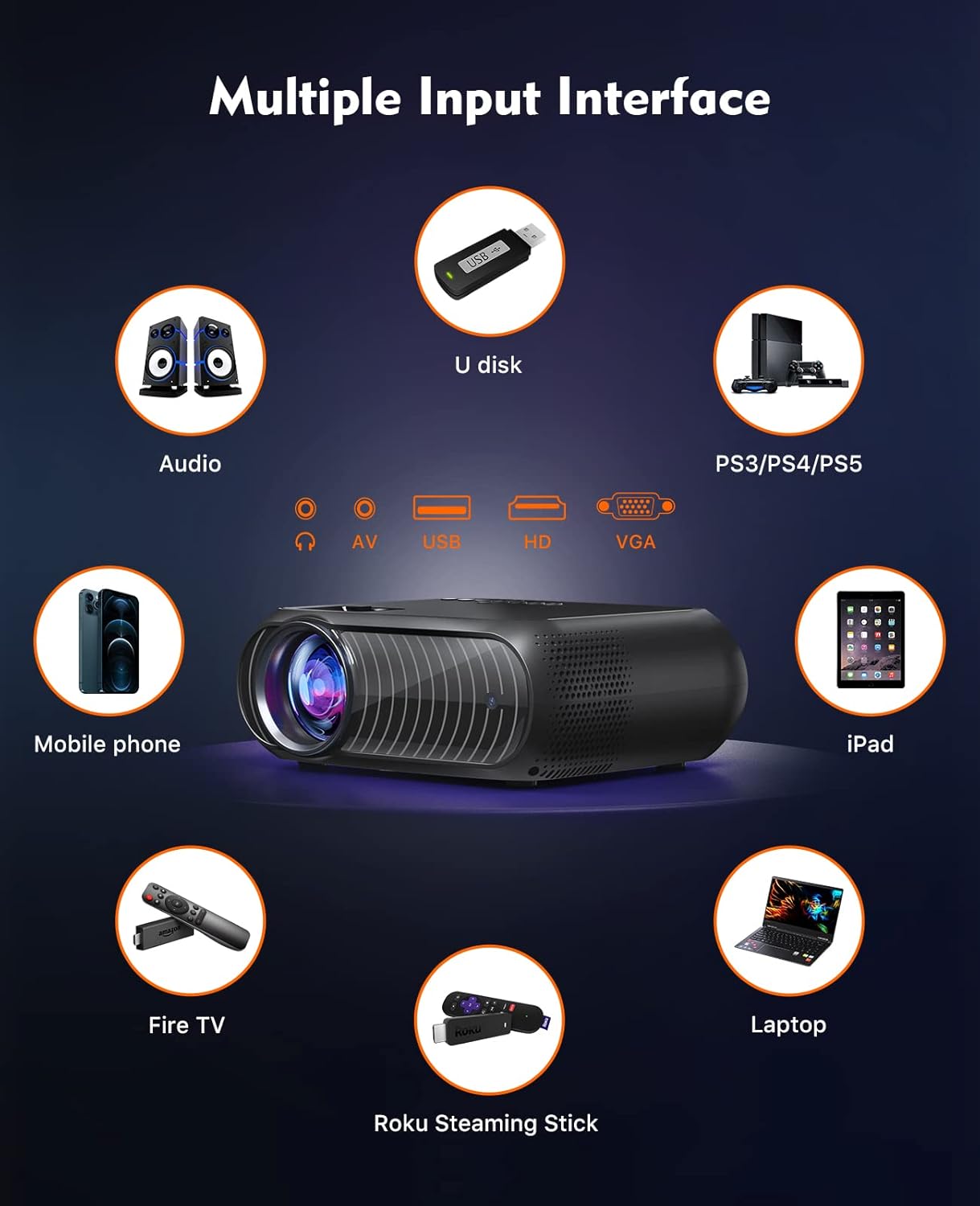 USB/HD/SD/AV/VGA inputs are inserted into the projector. It means that multimedia interface can completely meets your different demands, furthermore, you can also connect your iPad or tablet with HDMI adapters.