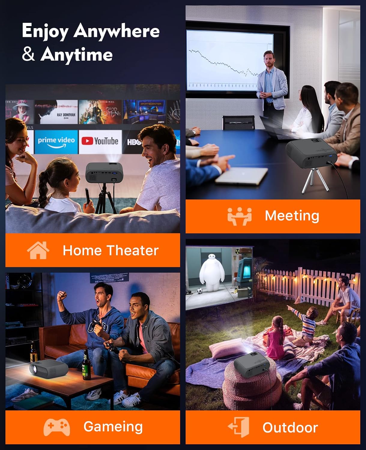 Multidirectional ProjectionSupport four directions projection (Front, Rear, Front Ceiling, Rear Ceiling) to meet your different demands. No matter where you use it (backyard, small conference room or bedroom with the dark circumstances), it also can provide the stunning experience for you. |