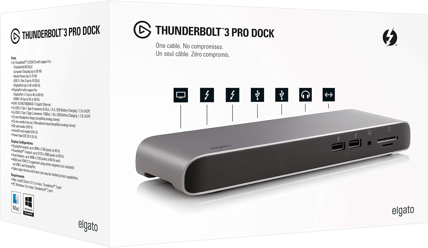 Elgato Thunderbolt 3 Pro Dock – With 50 Cm Thunderbolt Cable, 40Gb/S, Dual 4K Support, 2x Thunderbolt 3 (USB C), 4x USB 3.0, SD/Micro SD Card Reader, Audio I/O, Gigabit Ethernet, Aluminum Chassis.