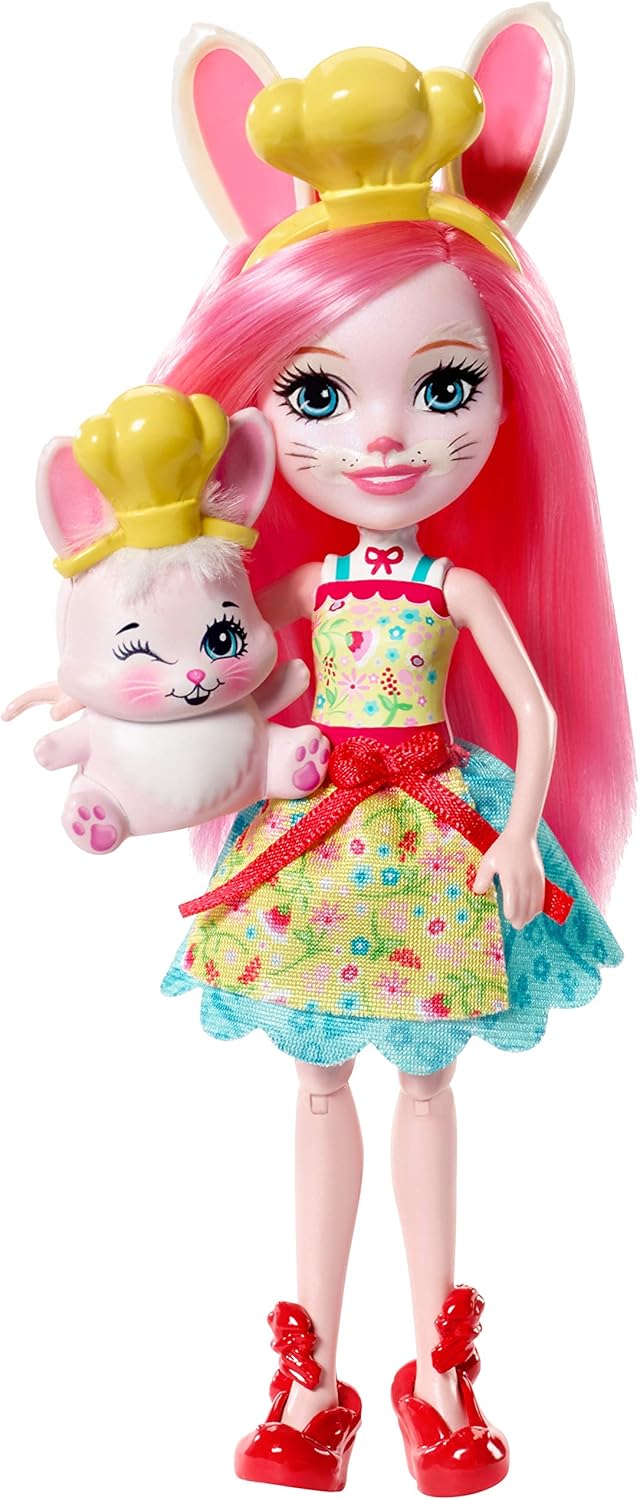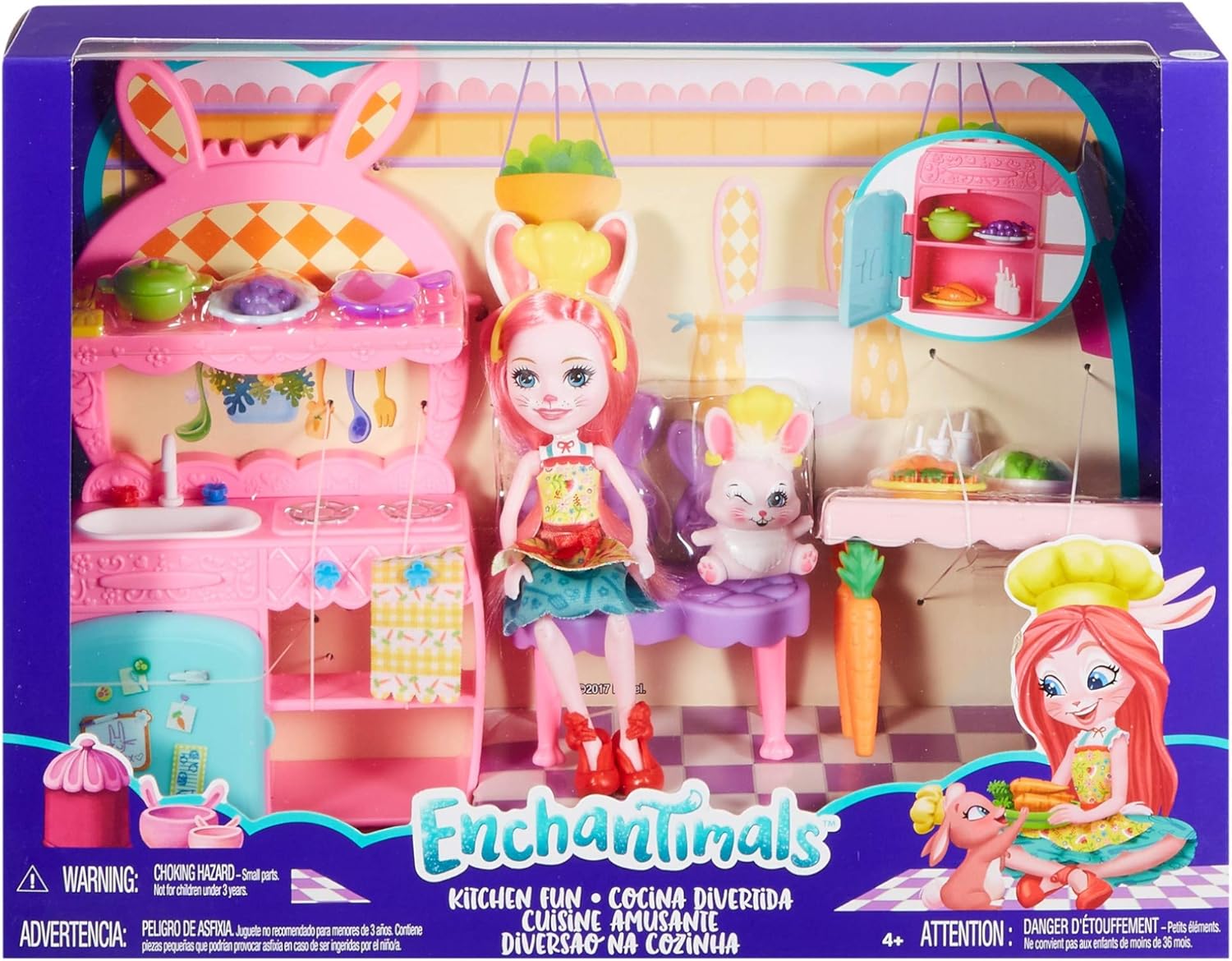Cook up delicious fun with Bree Bunny doll and Twist bunny in this charming kitchen playset inspired by the world of Enchantimals, a magical place nestled deep in nature! The Enchantimals are lovable characters who share a special bond with their animal friends. Bree Bunny doll and Twist bunny are always together -and they look alike, too! The playset comes with a six-inch Enchantimals doll, an animal friend figure, a kitchen set (complete with a stove, sink, and refrigerator), a dining table, double-seated bench, cooking utensils, and plates of food that look delicious enough to eat. Bree Bunny doll and Twist bunny are wearing matching yellow chef hats -excited to stir up imaginations with their adorable kitchenette. The two best friends can “cook” over the stove with the spatula, pots and pans (which all fit into doll hands). There is even a sink and a teal refrigerator door that really opens! When dinner is ready, set the pink dining table (that has adorable carrot-shaped legs!) with delicious plates of fruits and veggies. Sit the best friends on the bunny-inspired purple bench built for two, where they can enjoy special bonding time over their meal. Bree Bunny doll is so adorable in her chef-inspired outfit with a flower-printed apron, and sweet red shoes. Bree Bunny doll has enchanting touches that match her best friend Twist bunny -like bunny ears and facial features. Kids will love recreating the special friendship bond and celebrating a world where Caring is Our Everything. Collect them all to build out a world of Enchantimals and tell enchanting stories of your own (each sold separately, subject to availability). Colors and decorations may vary.