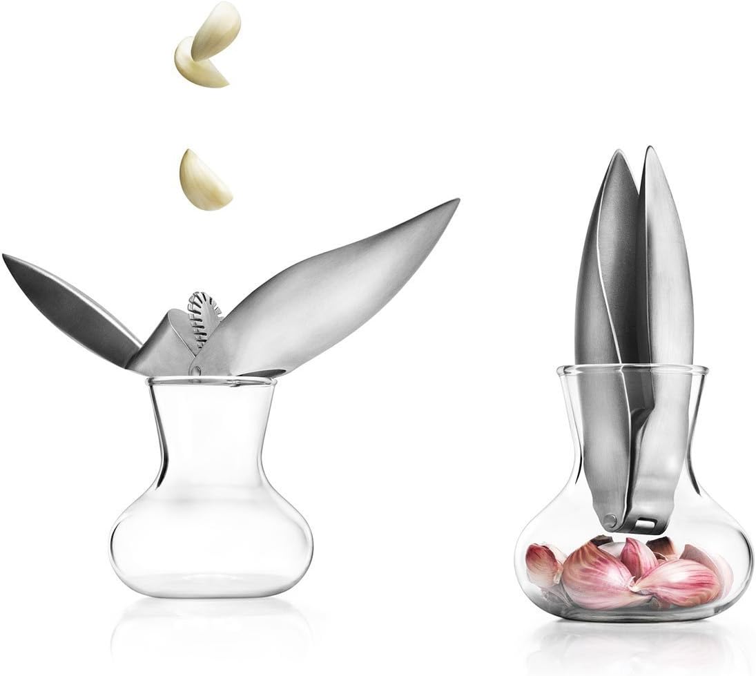 The Eva Solo garlic press is functional and easy to clean. Store garlic cloves in the hand-blown glass container which combined with the garlic press forms the shape of a head of garlic. Eva Solo imparts exclusive Danish design to everyday objects in the home. Simplicity, distinct lines and a high degree of functionality characterize the products in the collection.