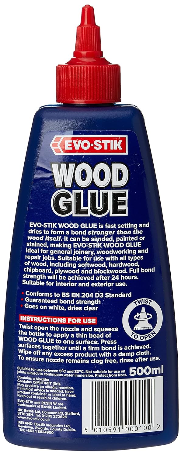 Evostik fast setting, extra strong weatherproof wood adhesive for interior or exterior use.