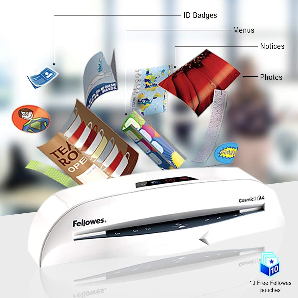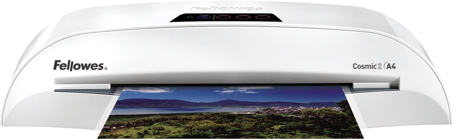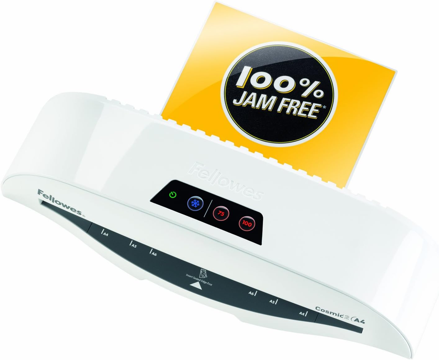 Fellowes Cosmic 2 A3 and A4 Home Office Laminators with 100% Jam Free* Technology and HeatGuard Advanced Safety System Fellowes Cosmic 2 A3 and A4 Home Office LaminatorsAt a Glance: Home office laminators For moderate use Ideal for work materials such as notices and presentations or hobby and craft 100% Jam Free* HeatGuard Technology advanced safety system 2 year warranty Starter kit for 10 documents included Suitable for use with 80-100 micron pouches (per side) *When using Fellowes branded pouches Fellowes Enhance80 laminating pouches for the perfect finish Why use a laminator? Materials that are important to us both in the workplace and in the home can often become damaged over time, with general wear and tear, smudges and fingerprints ruining the look of paper or card documents. A laminator is an essential tool to protect, preserve and display a variety of different materials, helping to keep them in a new- like condition for years to come. Signs and notices are instantly strengthened, splash proof and more durable. Presentation materials are given a quality professional looking finish and the colour and contrast of print materials is enhanced. Perfect and preserve with the Cosmic 2 Laminator Get protection and that professional quality finish in the comfort of your own home with the easy to use Cosmic 2 A3 and A4 Laminators. These intelligently designed home office laminating machines are suitable for moderate use and come with the Fellowes 100% Jam free* mechanism and HeatGuard technology, for added safety and consistently great results across a variety of different home laminating applications. 100% Jam Free* easy laminating for the perfect finish at home Fellowes knows that busy people need a laminating machine they can rely on. The last thing you need when adding that finishing touch your work, is a laminator that jams, causing frustration, ruined materials and unnecessary waste.