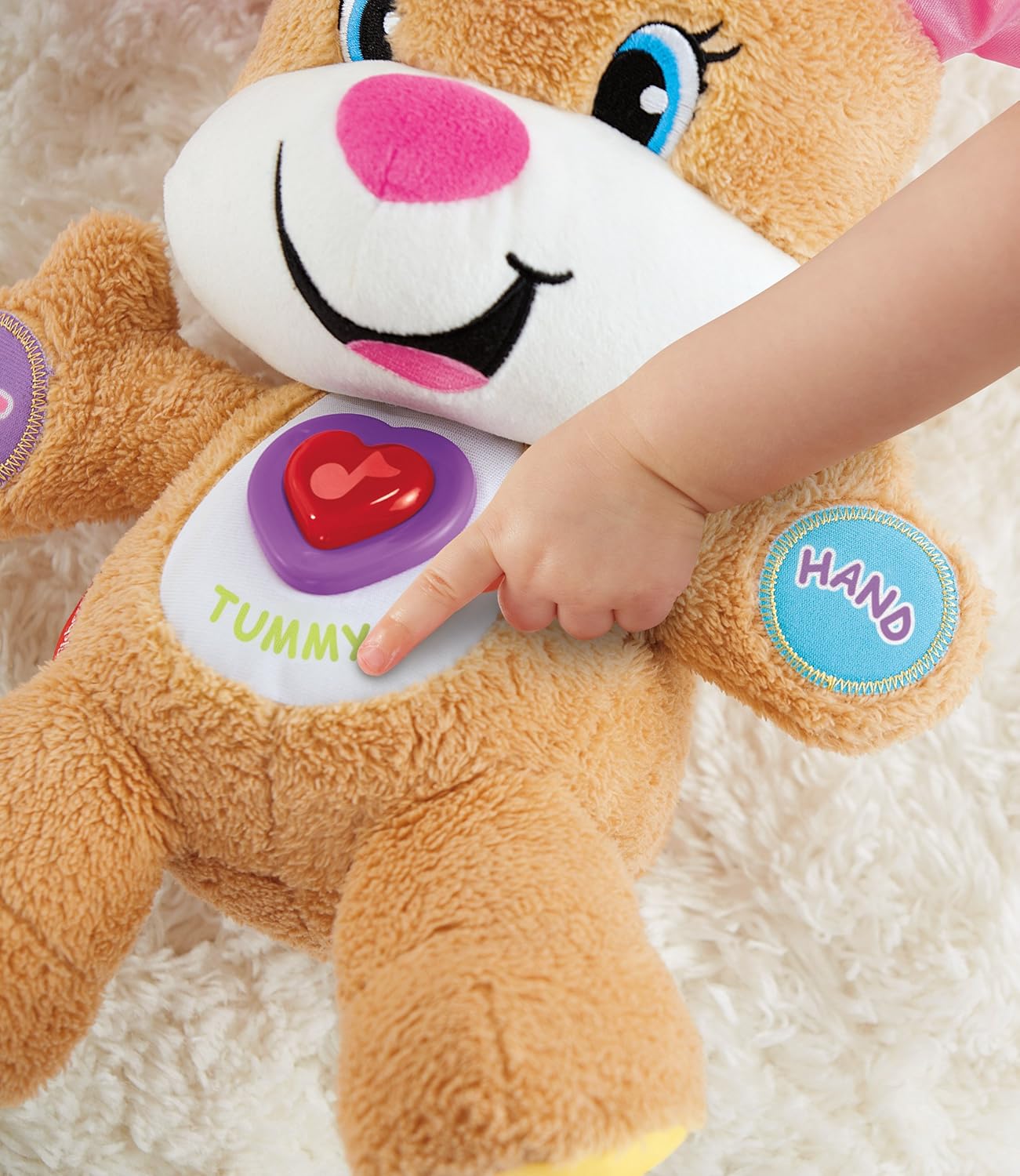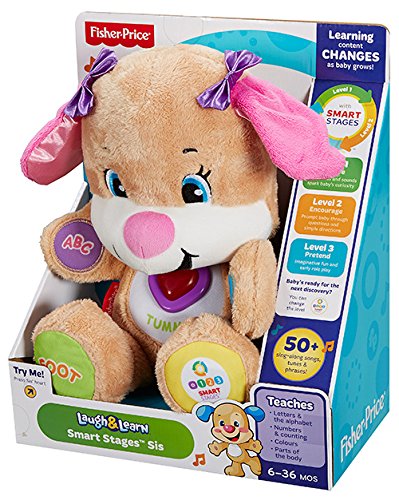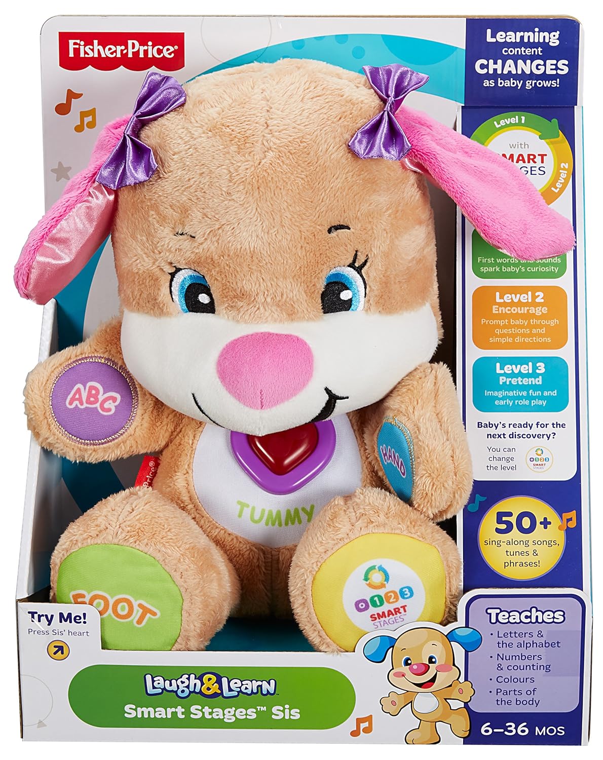 She’s the same soft, cuddly friend that responds to baby’s touch with silly sayings and sing-along songs – but now Sis has Smart Stages technology that changes the learning content as baby grows. Because every baby develops at their own pace, Smart Stages technology gives you the ability to select the stage that’s best for your child. There are a variety of developmentally appropriate songs, phrases and sounds within three levels of play. Sis’ light-up heart even twinkles along to the music.