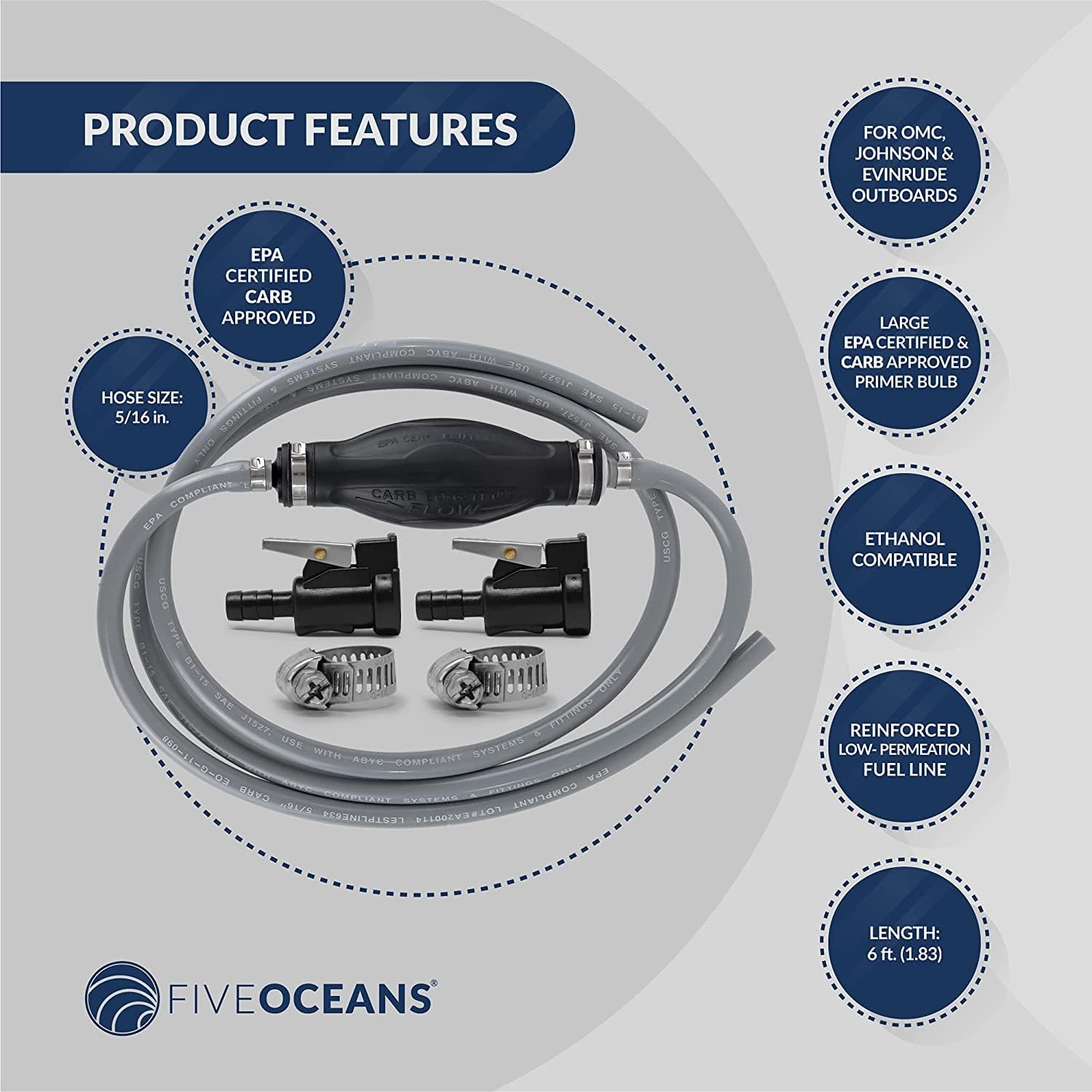 Five Oceans Boat Fuel Line, Marine Fuel Line, Outboard Fuel Line, Boat Fuel Line with Bulb, OMC/Johnson/Evinrude, 5/16 Inch Hose x 6 Ft, Reinforced EPA/CARB, Compatible Ethanol Blended Fuel FO3100-C1