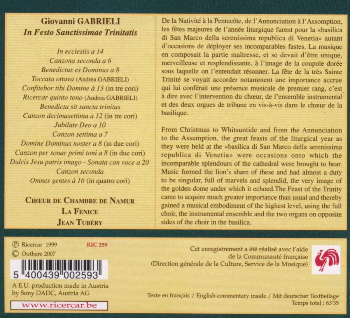 La Fenice and the Namur Chamber Choir give a second life to the music of Gabrieli. Devoted to the Feast of the Trinity, a major event of the liturgical year at the Basilica of San Marco in Venice. Includes a full catalog of the entire Ricercar 2008 collection.