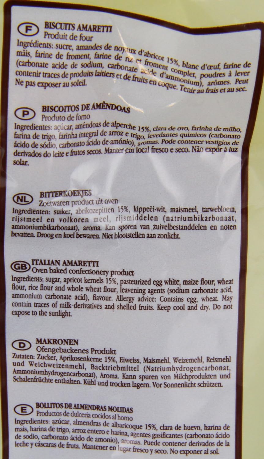 Amaretti is the Italian name for macaroons, which means little bitter things. Crisp and crunchy on the outside and soft inside, these small domed shaped cookies originated in Venice Italy during the renaissance period. Amaretti cookies are made from either ground almonds or almond paste, along with sugar and egg whites and can be flavoured with chocolate or liqueurs.Traditionally served with a sweet dessert wine or liqueur but they are also wonderful with a bowl of ice cream or with your favourite cup of coffee. Another favourite way to use these cookies is to finely ground them and then add them to desserts for added texture and flavour. 500 gram.