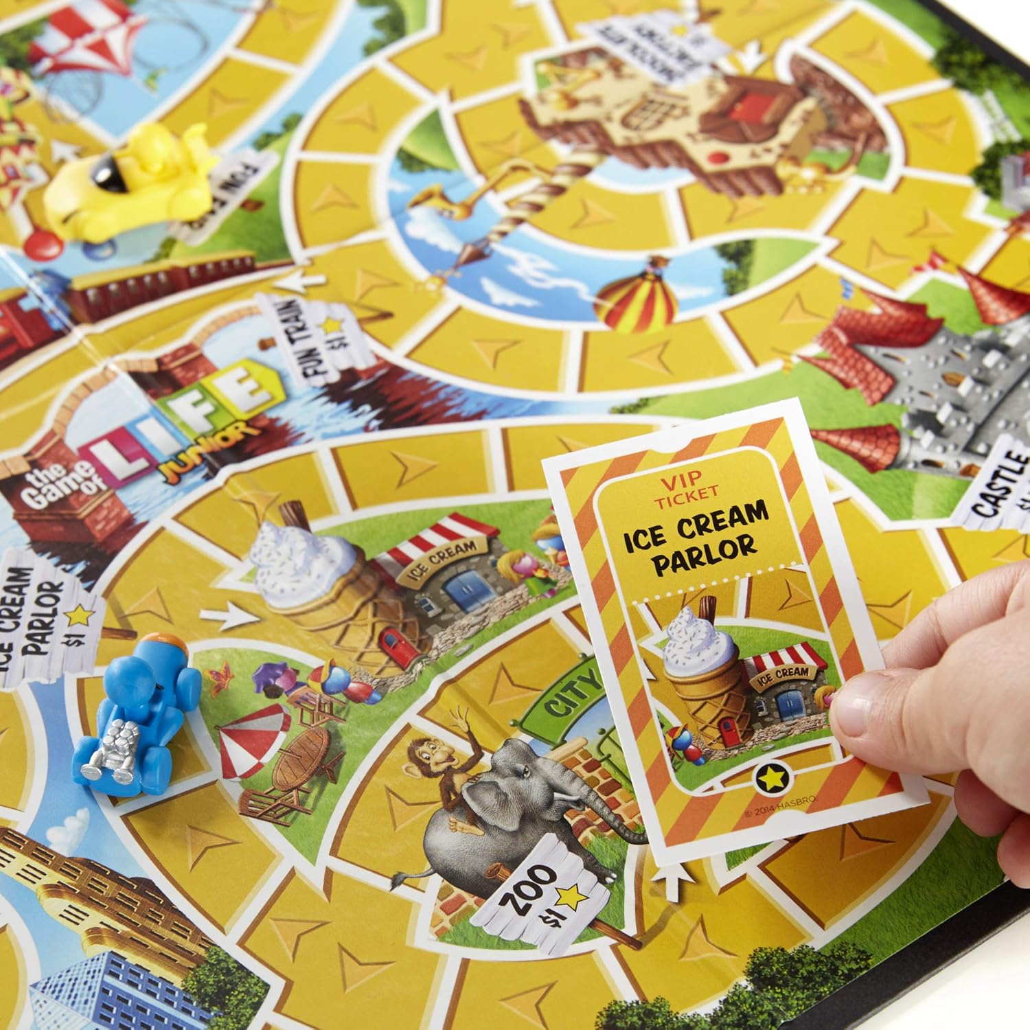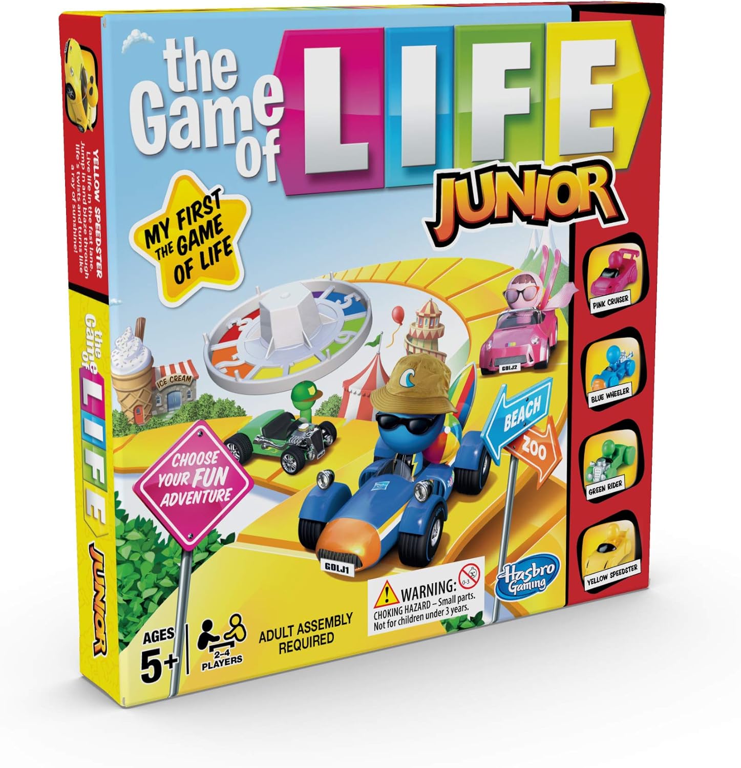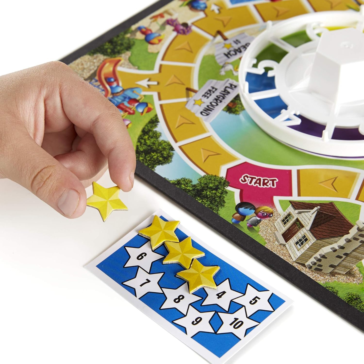 Choose your fun adventure with the game of life – junior style. This fun and fast-paced game is just like the adult version, but with much cooler rides. Pick the Blue wheeler the Pink cruiser, the Yellow speedster or the Green rider and start enjoying life’s twists and turns. Have tons of fun with adventures on the beach or at the zoo – it is your choice. Keep collecting stars and see how the action cards and attractions like the museum or the chocolate factory affect your fate. If you get to 10 stars first, you win. You will have a fun game and an whenever you play the game of life junior game. The Game of life and all related characters are trademarks of Hasbro.
