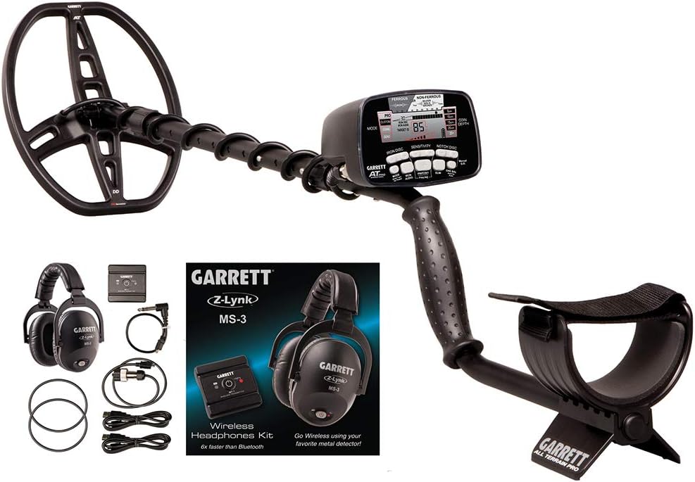 Garrett AT Pro International metal detector with MS-3 Z-Lynk wireless headphone kit. This all-terrain detector offers new and exclusive Garrett technology that makes it ideal for hunting coins, relics, caches, jewelry, and even gold nuggets. Select from either Standard or Professional search modes with enhanced audio features.